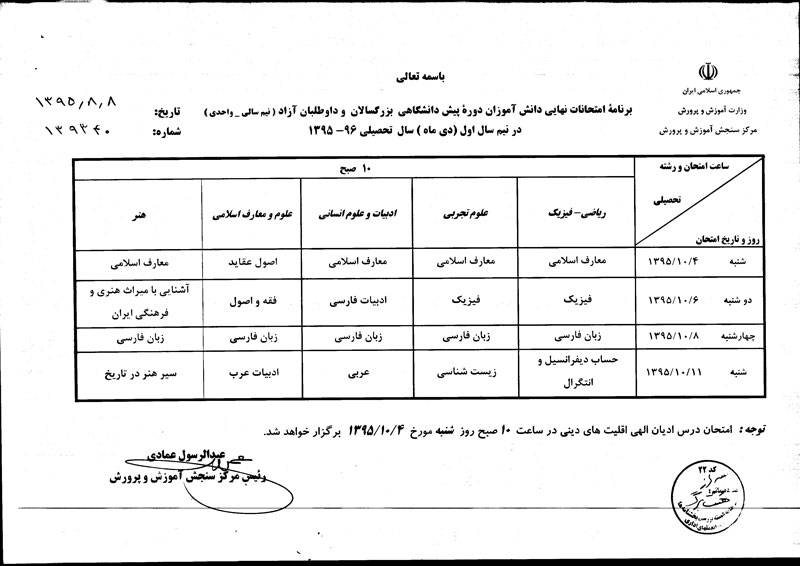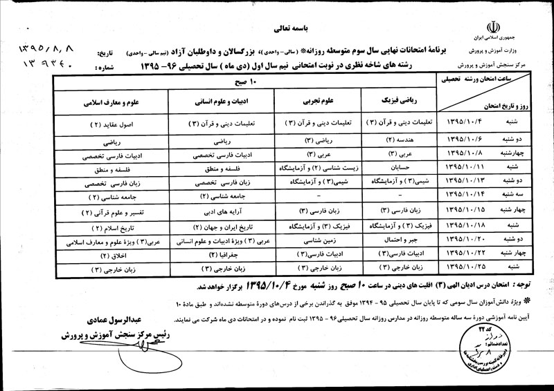 برنامه امتحان نهایی دی 95 را در ادامه مشاهده کنید.