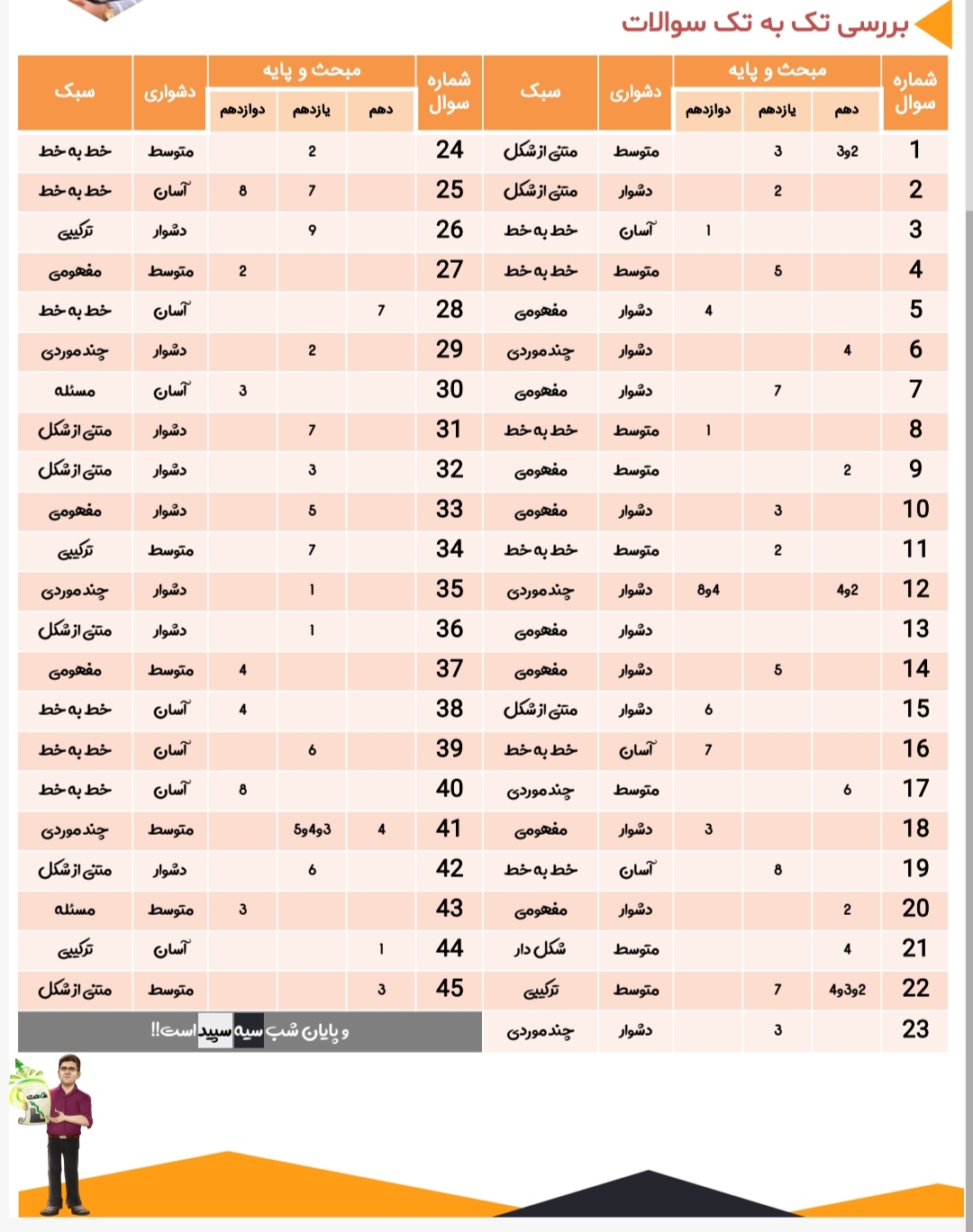 به طوری که پایه دوازدهم ۵۰ درصد سوالات را تشکیل داده و پایه دهم و یازدهم به ترتیب ۶و۹ سوال را به خود اختصاص داده بودند