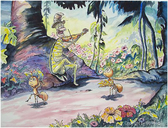 مورچه هر روز غذا و خوراکي جمع ميکرد و آنها را در خانهاش که در تنهي درخت کوچکي قرار داشت، انبار ميکرد. او براي خوراکش، دانه و ميوه جمع ميکرد و براي روشن کردن آتش در فصل زمستان هم چوب ذخيره ميکرد. امّا ملخ تنبل، زير نور خورشيد ميخوابيد و از هواي لطيف و زيبا استفاده ميکرد و آوازهاي خوش سر ميداد.