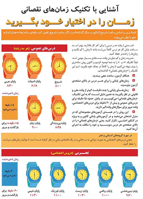 زمانهای پایانی را چند دقیقه کمتر از وقت مقرر و قانونی در نظر بگیرید؛ به همین دلیل است که به این تکنیک، «زمانهای نقصانی» میگوییم. در پایان، حدود 15 دقیقه برای درسهای عمومی و بیش از 30 دقیقه برای درسهای اختصاصی، وقت مرور برای سؤالهای وقتگیر دارید.