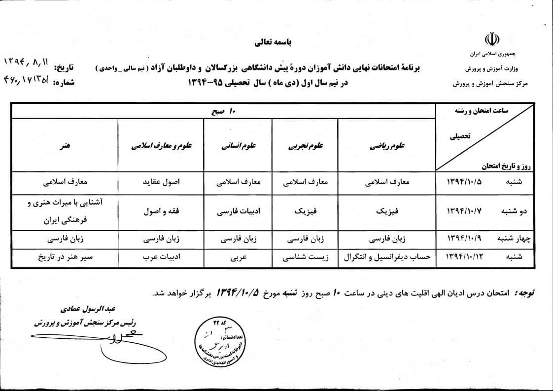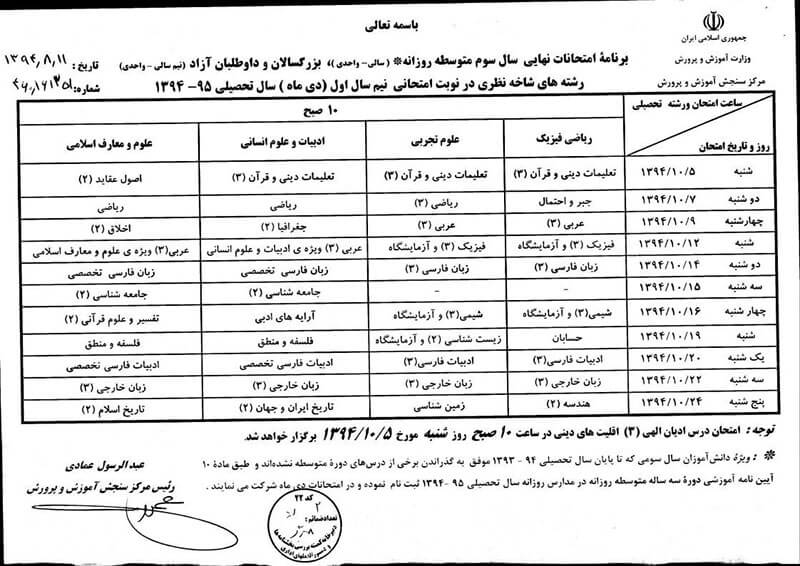 عبدالرسول عمادی رئیس مرکز سنجش وزارت آموزش و پرورش با اشاره به برنامه امتحانات نهایی دی ماه دانشآموزان، اظهار داشت: امتحانات نهایی شامل دانشآموزان سال سوم متوسطه نظری شیوه سالی ـ واحدی، روزانه ویژه دانش آموزان روزانه نیمسالی ـ واحدی ویژه دانشآموزان بزرگسال و داوطلبان آزاد و دانشآموزان سال سوم متوسطه رشتههای فنیوحرفهای و داوطلبان بزرگسال دوره پیشدانشگاهی میشود.