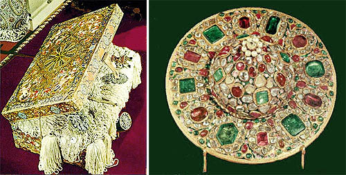 بعداً نادر براي پس گرفتن آن قسمت از جواهرات كه به هندوستان منتقل شده بود، نامههايي به دربار هند نوشت، اما جواب نامساعد شنيد. پس از لشكركشي نادر به هند (1158 ق)، محمدشاه گوركاني مبالغي نقدينه، جواهر و اسلحه تسليم نادر كرد. اما بخشي از اموال و خزايني كه نادر از هندوستان به دست آورده بود به ايران نرسيد و در راه بازگشت به ايران از ميان رفت. نادر پس از بازگشت به ايران، مقدار قابل ملاحظهاي از جواهرات را به رسم ارمغان براي امرا و حكام و شاهان كشورهاي همسايه فرستاد. همچنين مقداري از اشياي نفيس و مرصع را به آستان حضرت امامرضا (ع) تقديم كرد و مقداري را نيز به سپاه خود بخشيد. در 1160 ق، پس از قتل نادر، احمد بيگ افغان ابدالي، از سرداران نادر، دست به غارت جواهرات خزانه نادر زد. از جمله گوهرهايي كه از ايران خارج شد و هرگز بازنگشت، الماس معروف كوه نور بود. اين الماس در 1266 ق، به ملكه ويكتوريا اهدا شد.
