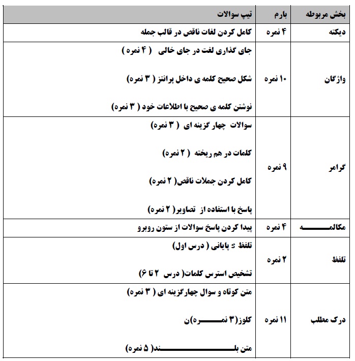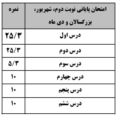 مطالب این درس در امتحانات نهایی به صورت زیر طبقهبندی میشود: