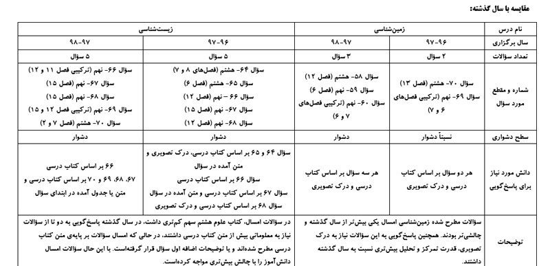 *** لازم به ذکر است که تعداد سؤالات اختصاص یافته به زمین و زیستشناسی امسال، یکی بیشتر از سال گذشته بودهاست.