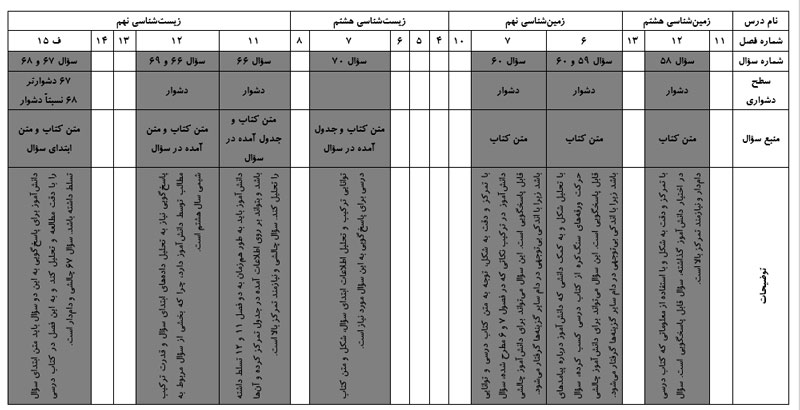 **** در خصوص سؤالات زمینشناسی، در هر سه سؤال علاوه بر درک مفاهیم، درک تصویری نیز دانشآموز نیز هدف قرار گرفته است و با تکیه بر توجه و تمرکز به تصاویر قابل پاسخگویی هستند. به علاوه دانشآموزی که تسلط کافی بر متن کتاب علوم هشتم و نهم و تصاویر آن داشته، با دقت و تمرکز قادر به پاسخگویی این سؤالات بودهاست. به طور کلی سطح سؤالات دشوار (با توجه به ملاک کتاب سه سطحی) ارزیابی میشود.