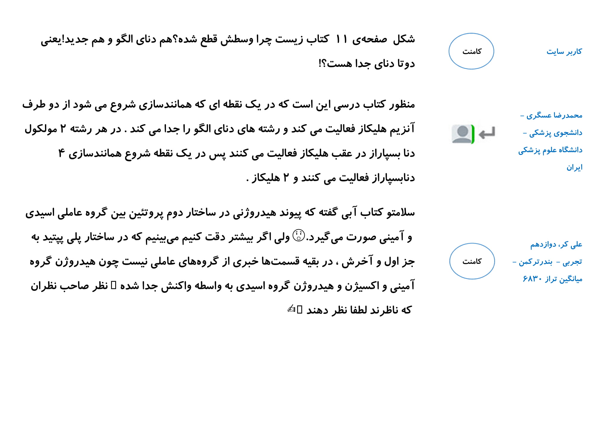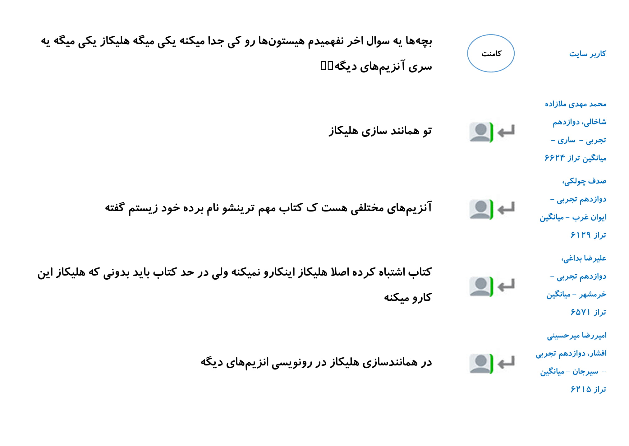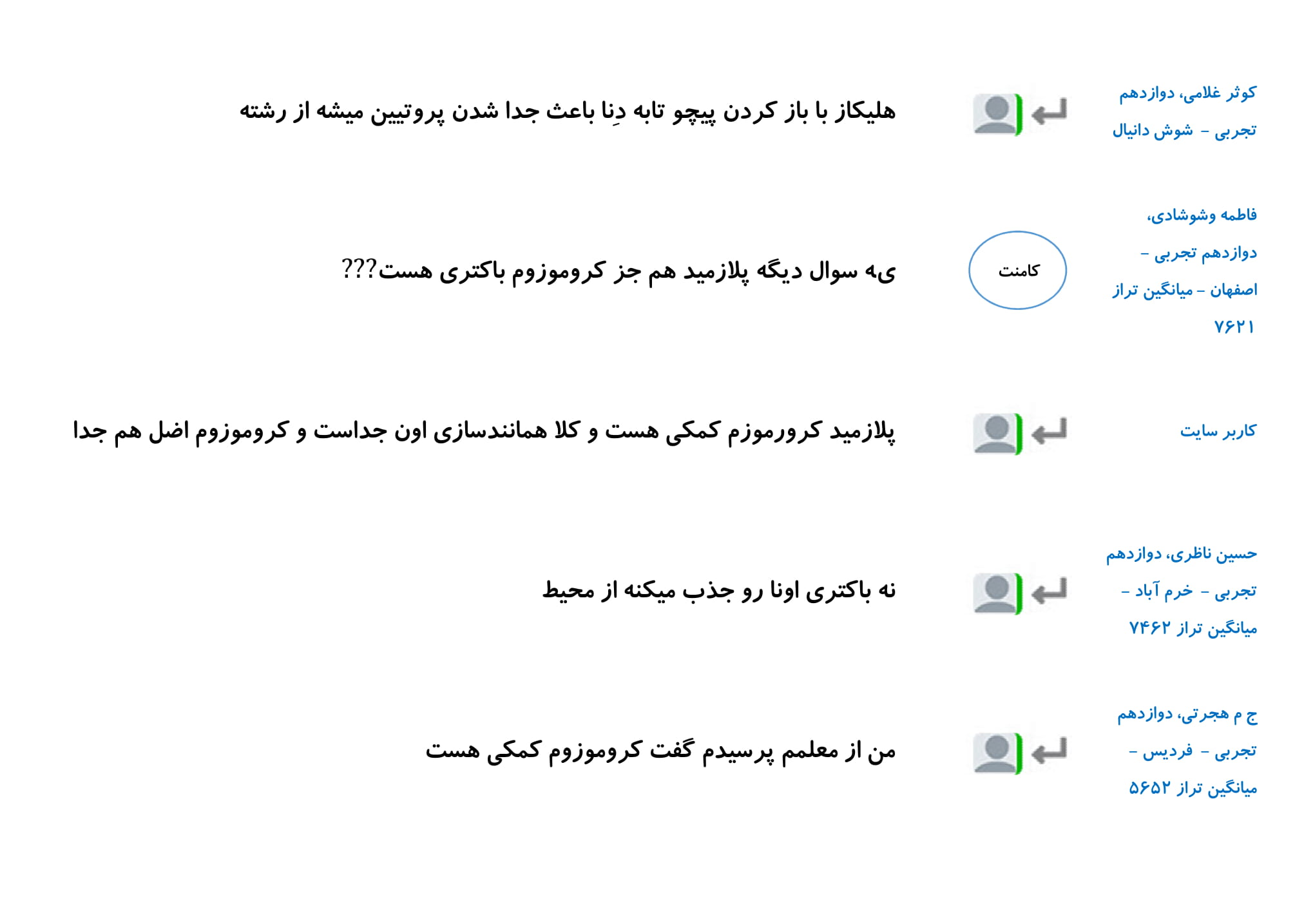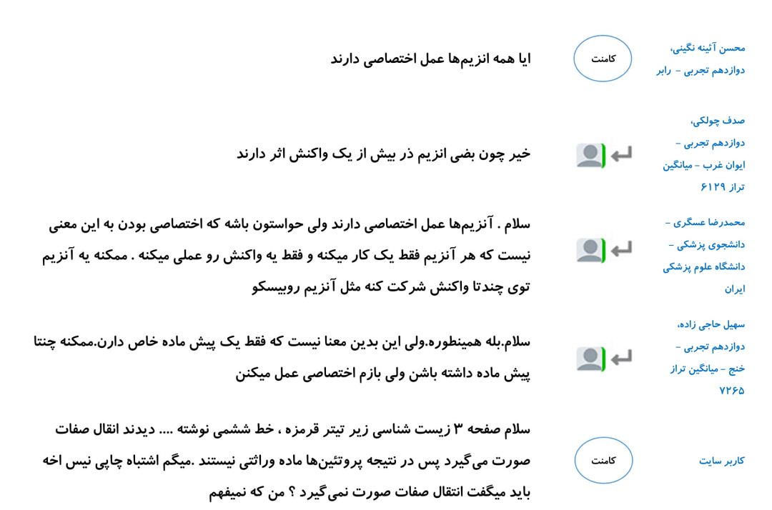 در این مطلب مجموعه پرسش و پاسخ های شما دانش آموزان در رابطه با فصل اول زیست دوازدهم را گردآوری کرده ایم. امیدواریم خواندن این کامنت ها در درک بهتر این فصل به شما کمک کند.