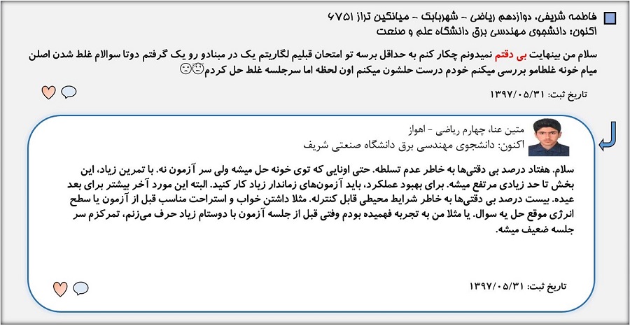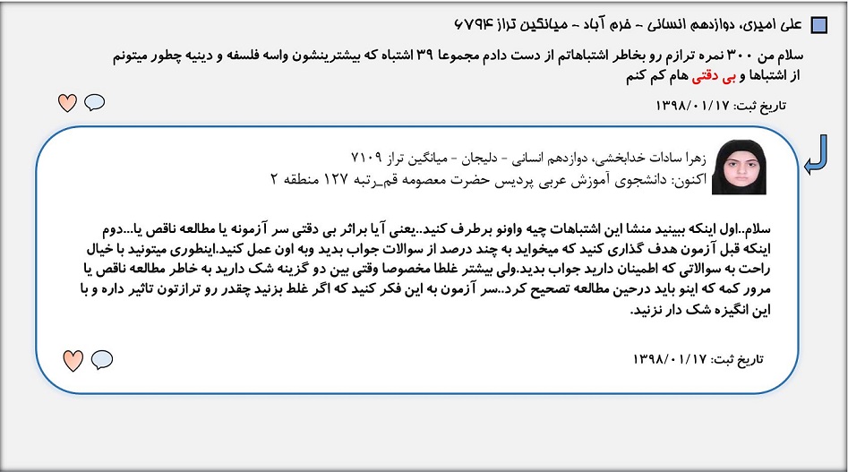 برای پاسخ به این پرسش ها و پرسش هایی از این دست ما در این مطلب برای شما گفتگوهای رتبه های برترکنکور در سایت کانون در رابطه با بی دقتی را آورده ایم،این پاسخ ها مربوط به زمانی است که این رتبه برترها مانند شما دانش آموز بودند و در قسمت کامنت های سایت کانون با سایر دانش آموزان به گفتگو میپرداختند،در این مطلب ما علاوه بر میانگین تراز آن ها در آزمون های کانون،رشته و دانشگاهی که این عزیزان اکنون در آن مشغول به تحصیل هستند را نیز آورده ایم،شما هم در انتهای این مطلب نظرات خودتون و راهکارهایی که برای کاهش بی دقتی انجام دادین را برامون بنویسید و تجربه های خودتون در زمینه ی بی دقتی رو با ما در میون بذارید تا سایر دوستاتون هم استفاده کنند چه بسا شما همون رتبه ی برتری باشید که ما سال بعد برای ایجاد مطلب از نظرات ارزشمندش استفاده میکنیم.
