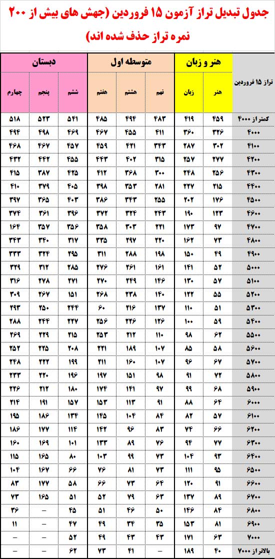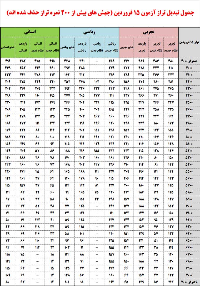 شما می توانید به کمک این جدول نمره ی تراز آزمون غیرحضوری 15 فروردین را به آزمون حضوری تبدیل کنید.