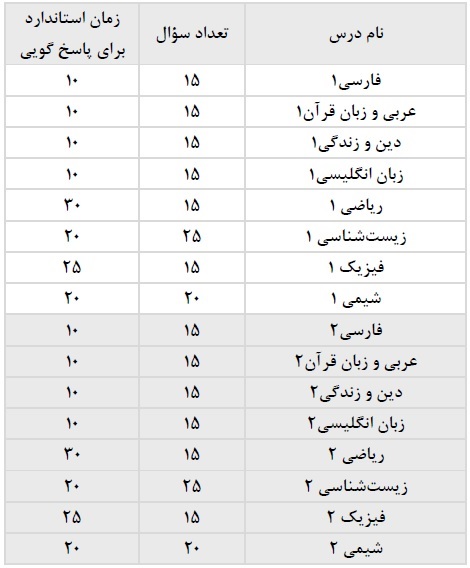 6-تعداد سوال هر درس و زمان استاندارد پاسخ گویی در این آزمون به چه صورت است؟