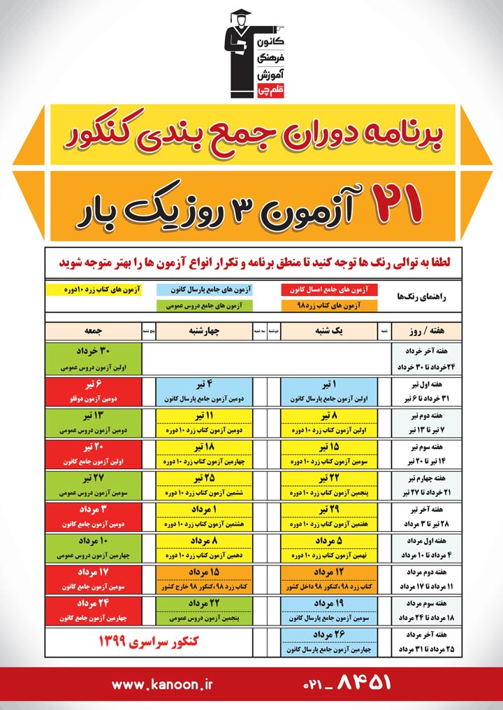 هفته ی اول تیر در روزهای یکشنبه و چهارشنبه : در دو آزمون جامع پارسال کانون شرکت می کنید . دو آزمون دیگر جامع پارسال را در دو هفته ی پایانی برگزار خواهید کرد.