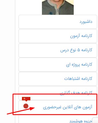2) در صفحه شخصی از منوی سمت راست آزمون غیرحضوری آنلاین را انتخاب کنید.