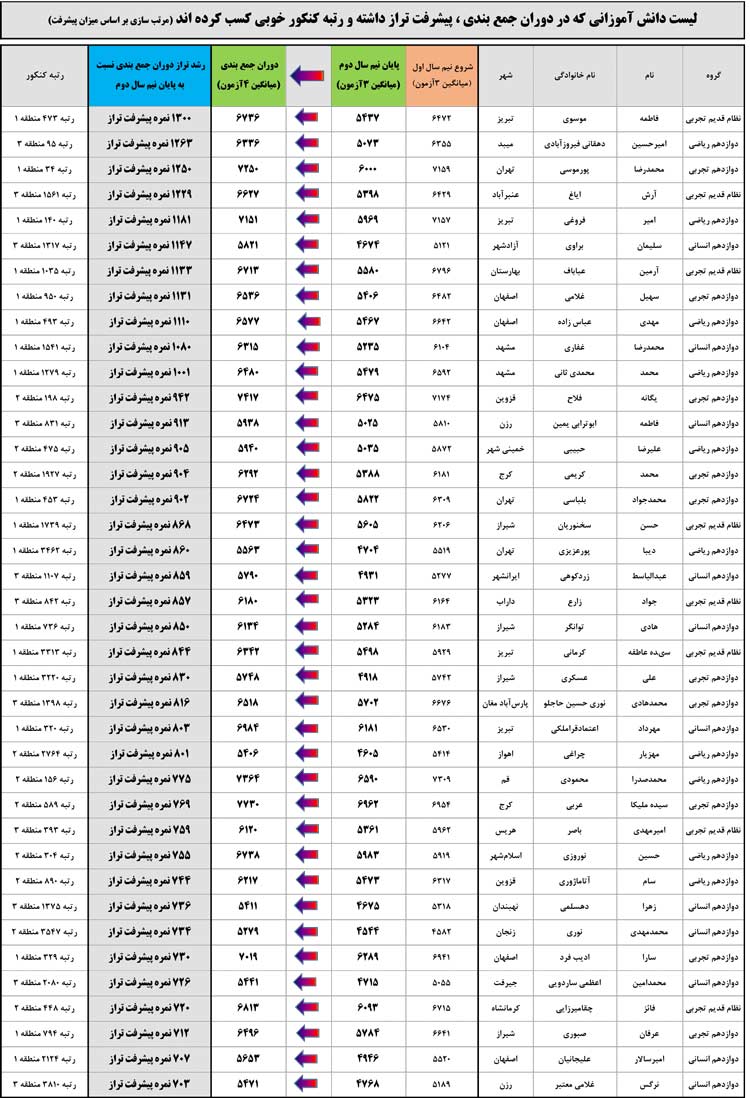 به این سوال با آمارهای واقعی پاسخ داده ایم . آمارها مربوط به پارسال و مربوط به دانش آموزان واقعی است . چرا دانش آموزان پارسال را انتخاب کردیم ؟ زیرا نتایج دانش آموزانی که در دوران جمع بندی پیشرفت کردند به طور کامل مشخص است . هم میزان پیشرفتشان در آزمون ها معلوم است و هم رتبه ی کنکورشان . میزان پیشرفت را در مقایسه با نیم سال دوم مشخص کرده ایم البته می توانید رشد تراز را با ابتدای سال هم مقایسه کنید . در این لیست بعضی دانش آموزان را می بینید که در نیم سال دوم و دوران طلایی نسبت به آغاز سال افت کردند اما توانستند در دوران جمع بندی به پیشرفت چشم گیربرسند .