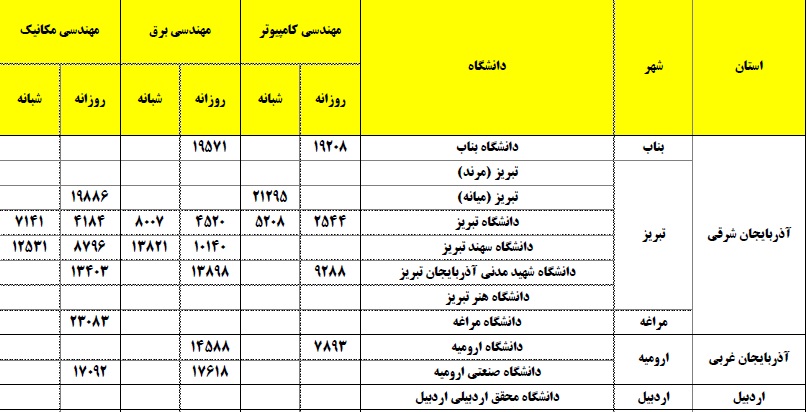 جدول های زیر ، حاوی اطلاعات رتبه های منطقه ای دانش آموزان کانونی در کنکور 1398 می باشد. در این جدول در ستون اول ، نام دانشگاه ها ، به تفکیک استان و شهرهای مختلف آمده است و در ردیف اول نیز اطلاعات رشته ها ذکر شده است. در هرکدام از خانه ها نیز چارک پایین رتبه های منطقه ای درج شده است. منظور از چارک پایین رتبه های منطقه ای این است که اگر مثلا در رشته ای 100 نفر قبولی دانش آموزان کانونی داشته ایم رتبه منطقه نفر 75 ام چه مقدار بوده است.