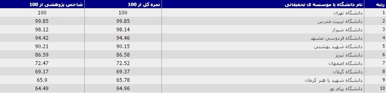 | رتبه | نام دانشگاه یا موسسه تحقیقاتی | نمره کل از ۱۰۰ | شاخص پژوهشی از ۱۰۰ |