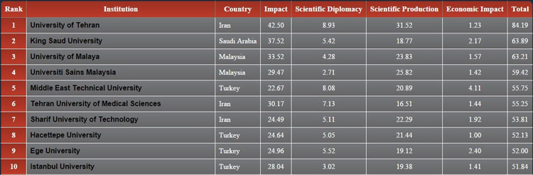 جدول زیر رتبه بندی دانشگاه ها و موسسات تحقیقاتی کشورهای اسلامی ۲۰۱۳-۲۰۱۴ کشورهای اسلامی را نشان می دهد. در این رتبه بندی دانشگاه تهران با ۸۴.۱۹امتیاز رتبه نخست در میان کشورهای اسلامی را به دست آورده است. بعد از آن دانشگاه های عربستان سعودی و مالزی به ترتیب رتبه های دوم و سوم را به دست آوردند. در میان ۱۰دانشگاه برتر دیگر در این رتبه بندی دانشگاه علوم پزشکی تهران و و دانشگاه صنعتی شریف نیز در جایگاه ۶ و ۷این جدول قرار گرفته اند.