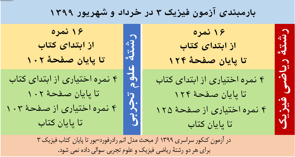 دفتر تالیف کتب درسی فیزیک : با توجه به تعطيلي مدارس از اسفندماه 1398 و ناتمام ماندن حدود 20 درصد از آموزش كتاب هاي درسي، بنا به تصميم اتخاذ شده، در آزمون هماهنگ كشوري پايه دوازدهم، 16 نمره از 80 درصد ابتداي كتاب، 4 نمره اختياري از 80 درصد اول كتاب و 4 نمره اختياري از 20 درصد پايان كتاب سوال داده مي شود. بر اساس اين سياستگذاري، بارمبندي آزمون فيزيك 3 در خرداد و شهريور 1399 براي هر دو رشته رياضي فيزيك و علوم تجربي به شرح زير خواهد بود.