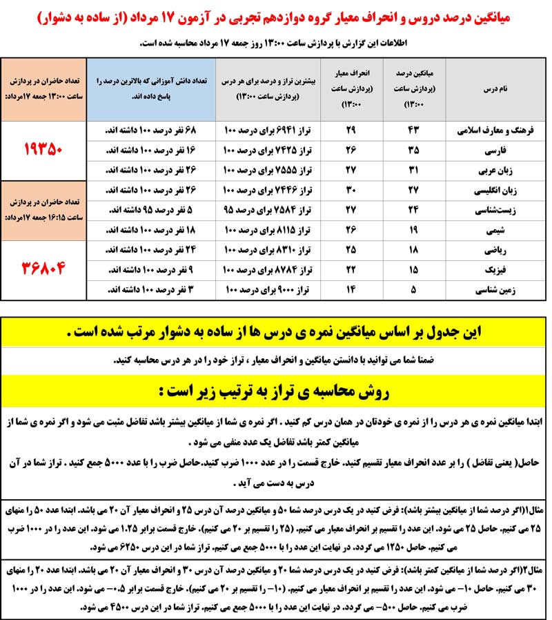 ضمنا شما می توانید با دانستن میانگین و انحراف معیار ، تراز خود را در هر درس محاسبه کنید. روش محاسبه ی تراز به ترتیب زیر است :