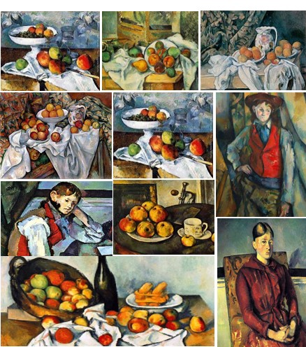 برخی آثار سزان: طبیعت بی جان با پارچه، طبیعت بی جان با سبد و میوه، پسری با جلیقه سرخ، قماربازان، آبتنی کنندگان، طبیعت بی جان با مجسمه گچی.