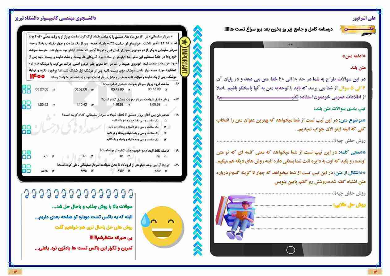 متن بلند یکی از زمان بر ترین سوالات سمپاد هست و سوالات متنوعی هم از این مبحث می تونن طرح کنن برای اینکه بتونین خیلی خوب تسلط داشته باشین حتما هر روز یک متن بلند تا روز سمپاد کار کنین حتماً هر روز باشه هاااا!!!!