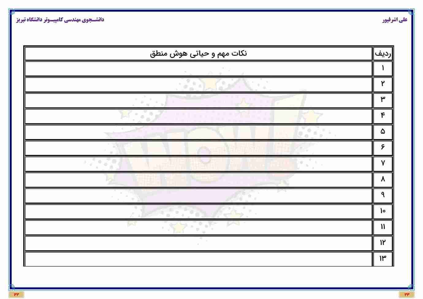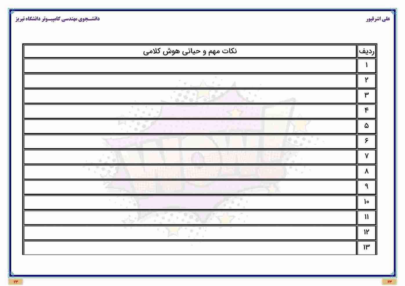 این صفحه توسط خودت پر میشه و تمام نکات مهمی که در هوش کلامی یاد گرفتی باید اینجا قشنگ و مرتب بنویسی و زمانی که میخوای جمع بندی کنی برای آزمون بخونی قط کافیه این صفحه رو یه دور مرور کنی چون همه نکات مهمی که تو نیاز داری رو داره:)))