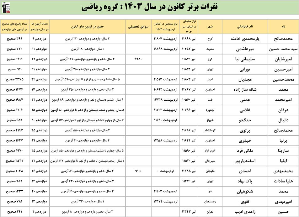 در لیست زیر با برخی از نفرات برتر کانون در گروه ریاضی در سال 1403 _ شرکت کنندگان در کنکور 1403 آشنا شوید.