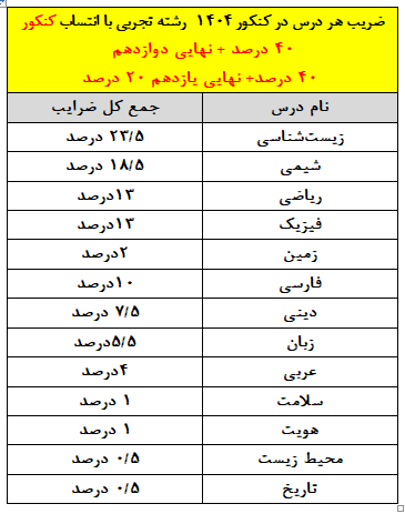 در جدول زیر جمع ضرایب هر درس را در کنکور 1404 رشته تجربی با انتساب؛
