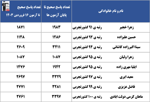 توجه کنید که این آمار مربوط به پاسخ های صحیح در آزمون های کانون تا آخرین آزمون (9 تیر 1403) پارسال بود