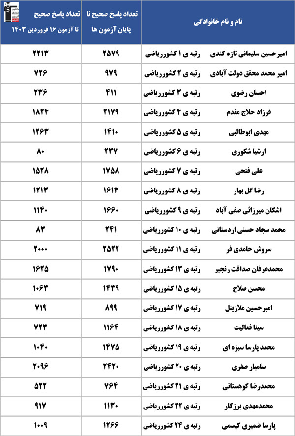 توجه کنید که این آمار مربوط به پاسخ های صحیح در آزمون های کانون تا آخرین آزمون (9 تیر 1403) پارسال بود