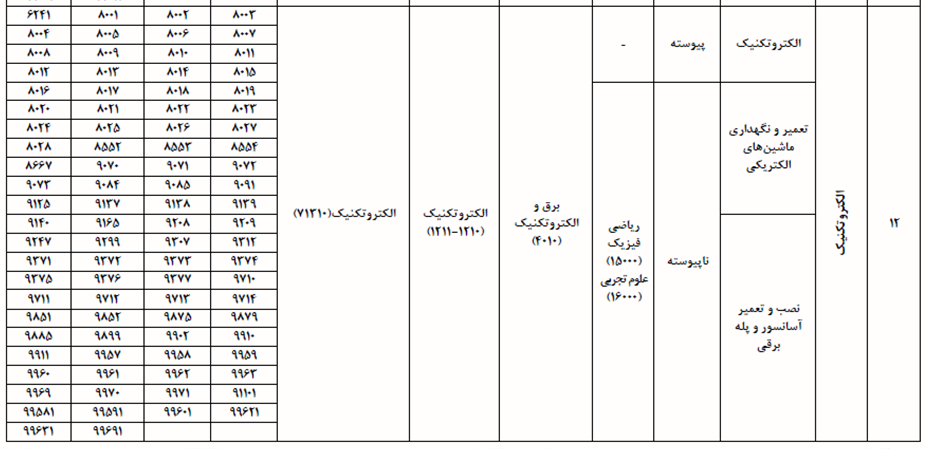اگر شما دانش آموز کاردانش هستید، در صورتی مجاز به شرکت در آزمون یکی از رشتههای پذیرش بر اساس آزمون هستید که کد رایانهای دیپلم شما طبق جدولهای زیر باشد:
