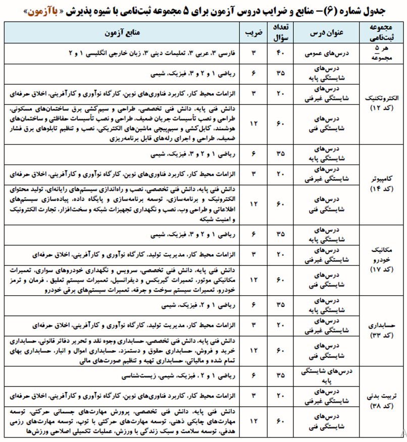 6- منابع و ضرایب درسهای آزمون برای 5 مجموعه ثبت نامی: