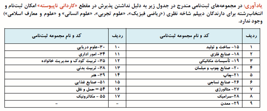 - متقاضیان فارغالتحصیل شاخه نظری فقط مجاز به انتخاب رشتههای تحصیلی کاردانی ناپیوسته میباشند که در کنار عنوان هر مجموعه ثبت نامی در جداول رشته محلها مشخص شده است.