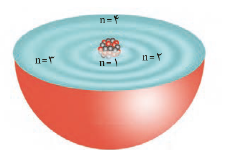 - 💠الکترون ها در فضایی بسیار بزرگ تر و در لایه هایی پیرامون هسته توزیع می شوند. این لایه ها را از هسته به سمت بیرون شماره گذاری می کنند. (شماره هر لایه را با n نمایش می دهند که به آن عدد کوانتومی اصلی می گویند). هر چه مقدار n بیشتر باشد، سطح انرژی آن لایه الکترونی بیشتر بوده و از هسته دورتر است.