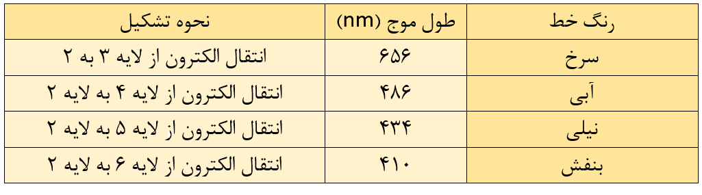 🔅هر نوار رنگی در طیف نشری خطی، نوری با طول موج و انرژی معین را نشان می دهد، نیلز بور بر این باور بود که از بررسی تعداد و جایگاه آنها، می توان اطلاعات ارزشمندی از ساختار اتم هیدروژن به دست آورد. او پس از پژوهش های بسیار، توانست مدلی برای اتم هیدروژن ارائه كند. اگرچه مدل بور با موفقیت توانست طیف نشری خطی هیدروژن را توجیه كند اما توانایی توجیه طیف نشری خطی دیگر عنصرها را نداشت.