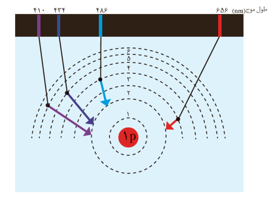- ⭕در طیف نشری خطی اتم های هیدروژن در ناحیه مرئی انتقال الکترون از (n=5 به n=2) نسبت به (n=3 به n=2) طول موج بلند تری دارد.
