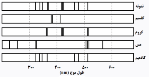 پ) شکل رو به رو، طیف نشری خطی یک نمونه مجهول را نشان می دهد. با توجه به طیف نشری خطی عنصر های داده شده، مشخص کنید در نمونه مجهول چه فلز هایی وجود دارد؟