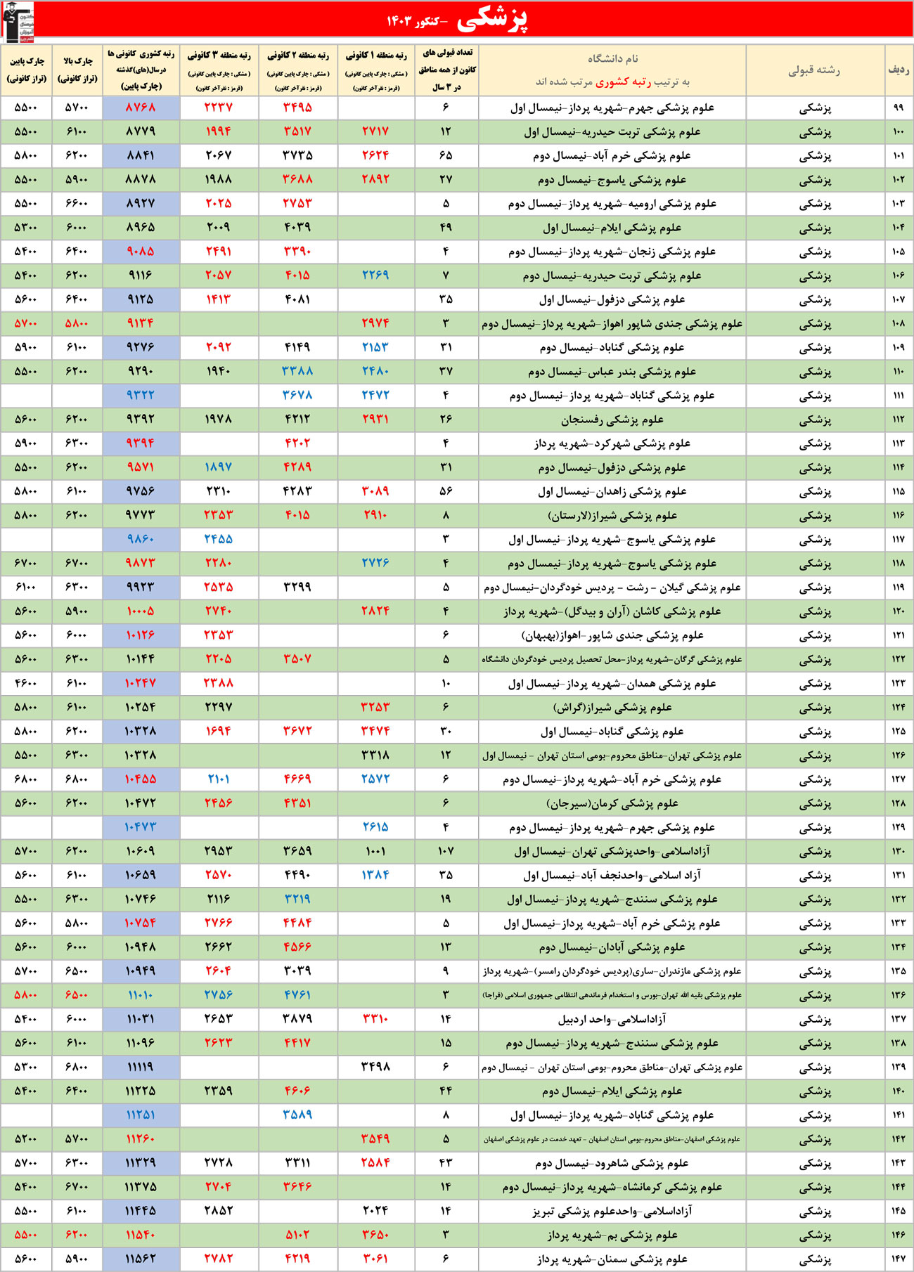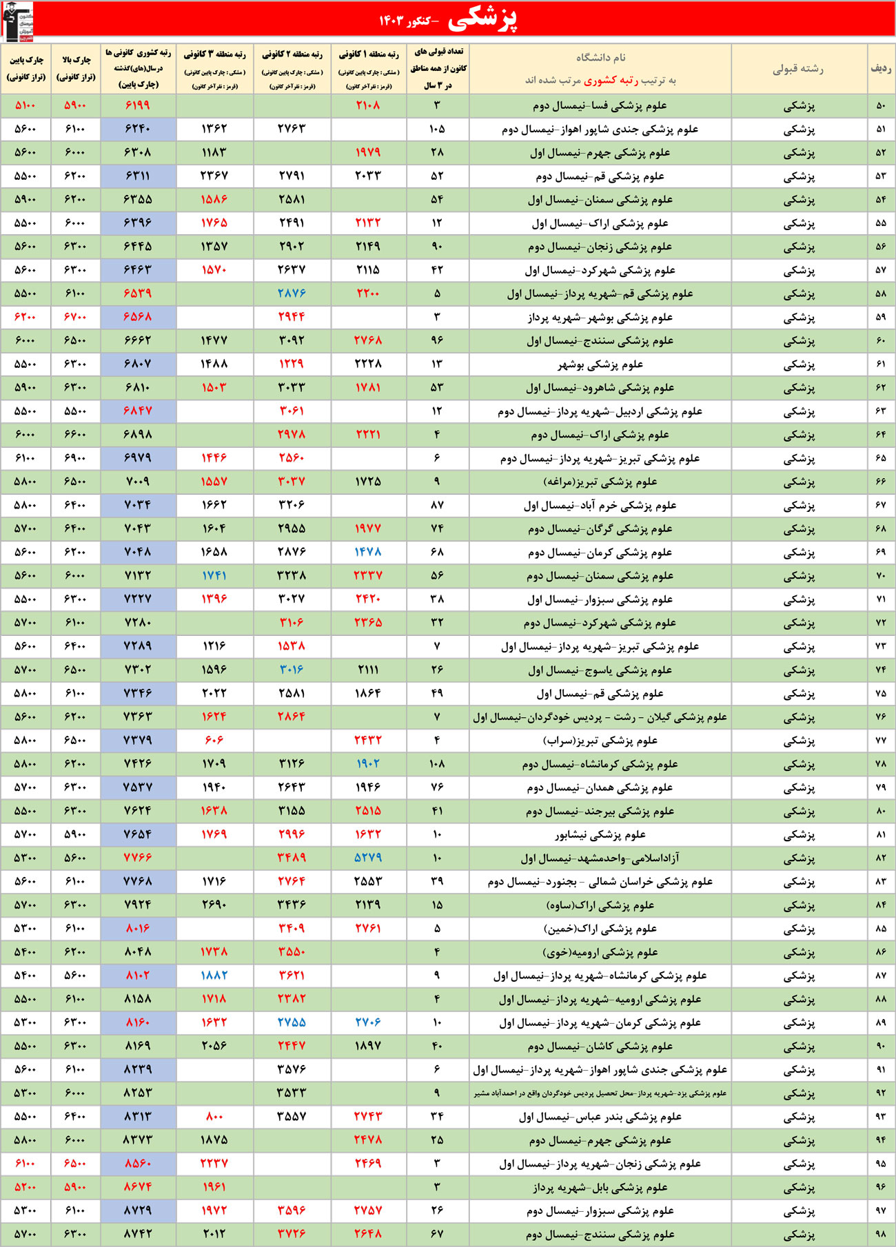همچنین جدول سایر رشته ها به تدریج منتشر مشود.