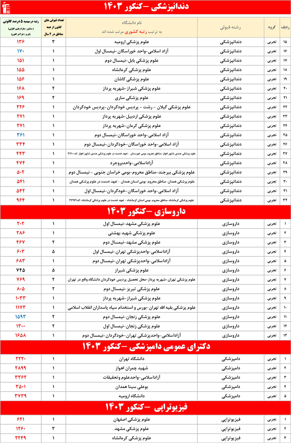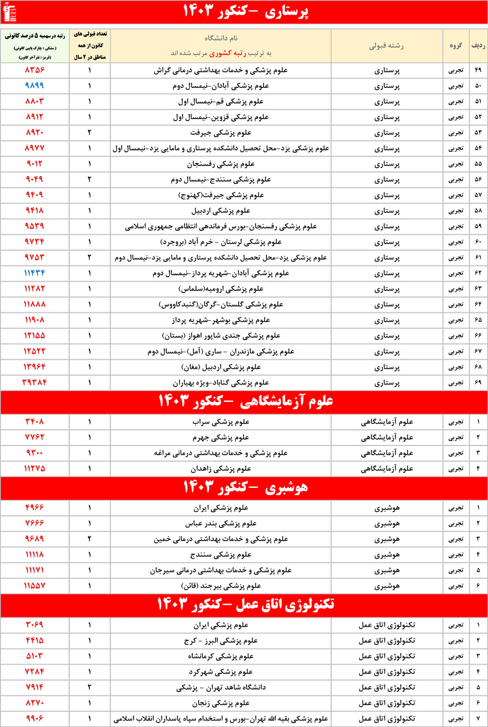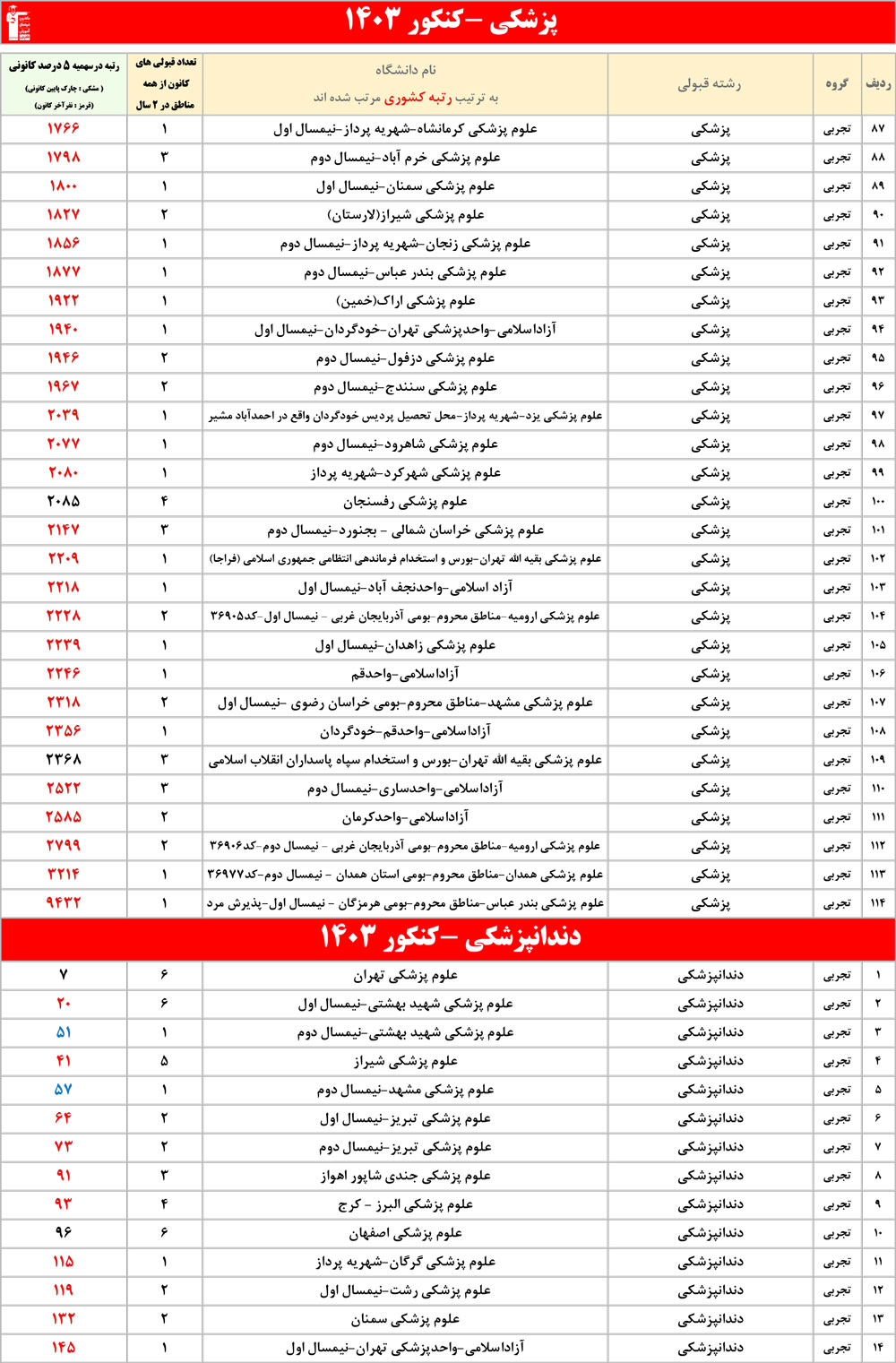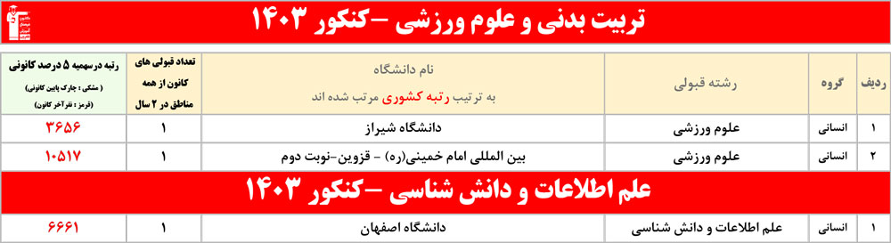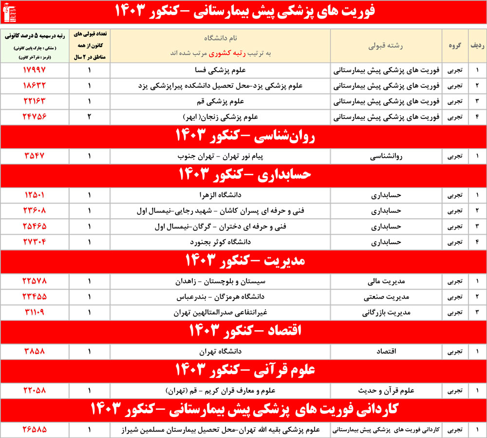 رنگ قرمز: مربوط به قبولی های کمتر از 3 نفر است