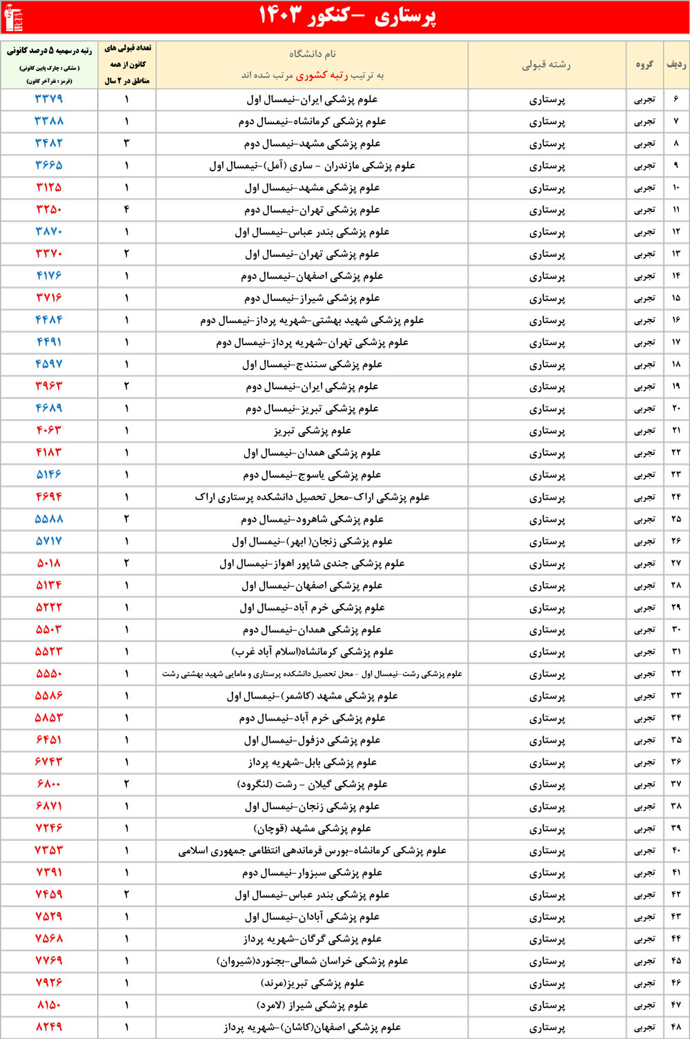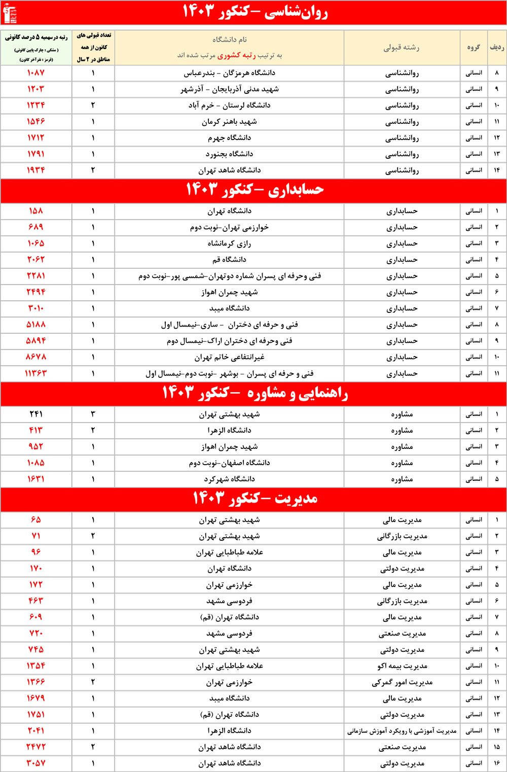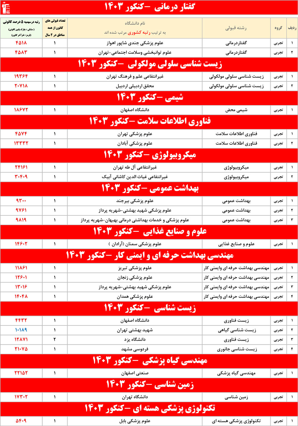 رنگ قرمز: مربوط به قبولی های کمتر از 3 نفر است