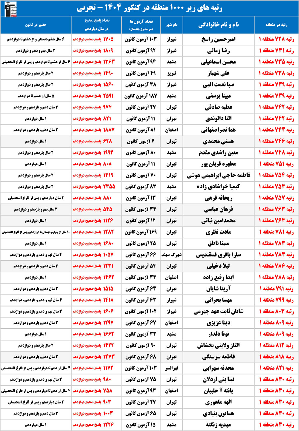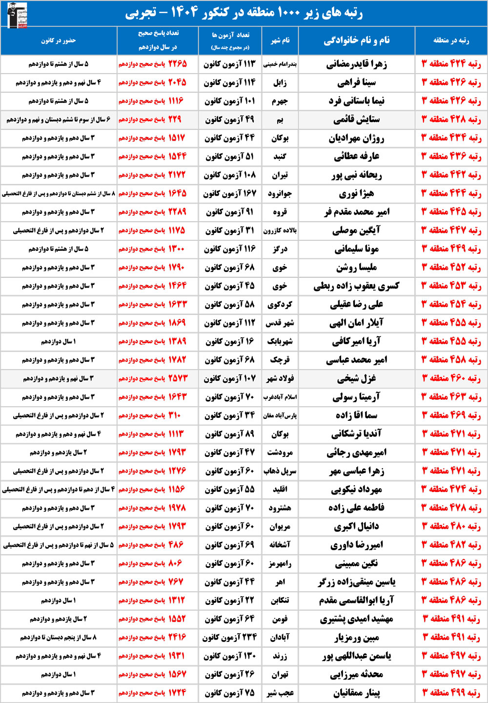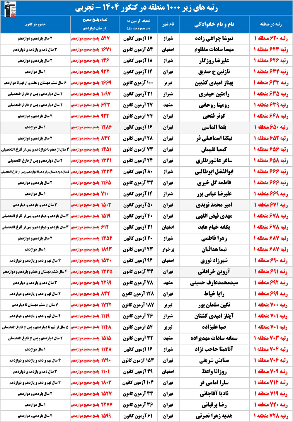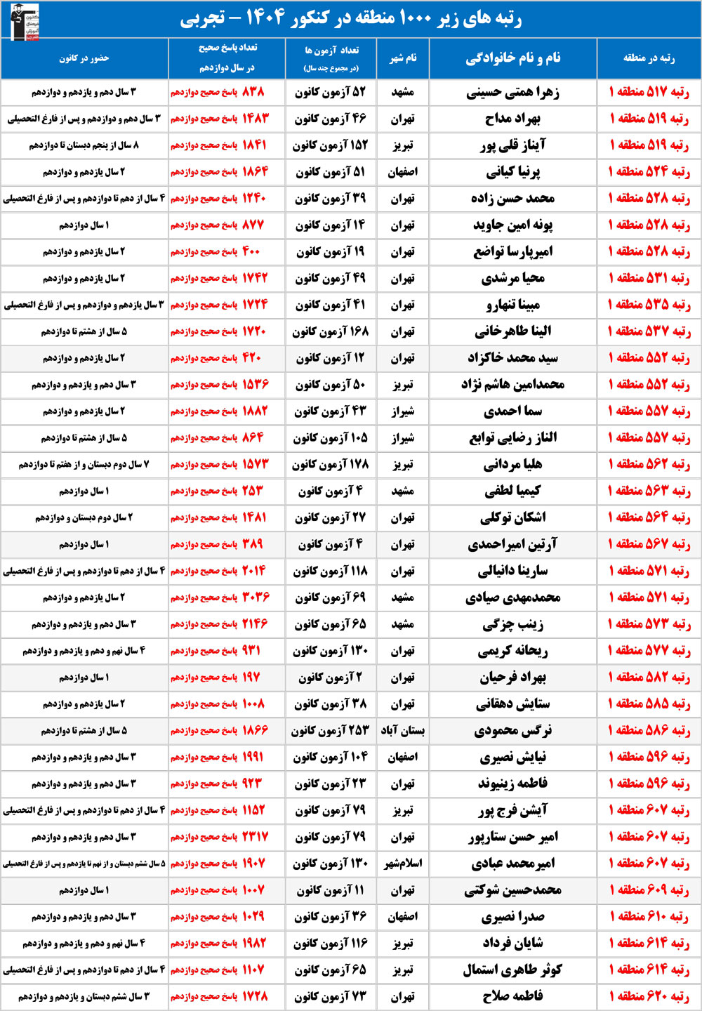 در ادامه با رتبه های زیر 1000 منطقه کانونی در کنکور 1404 در رشته تجربی آشنا شوید.