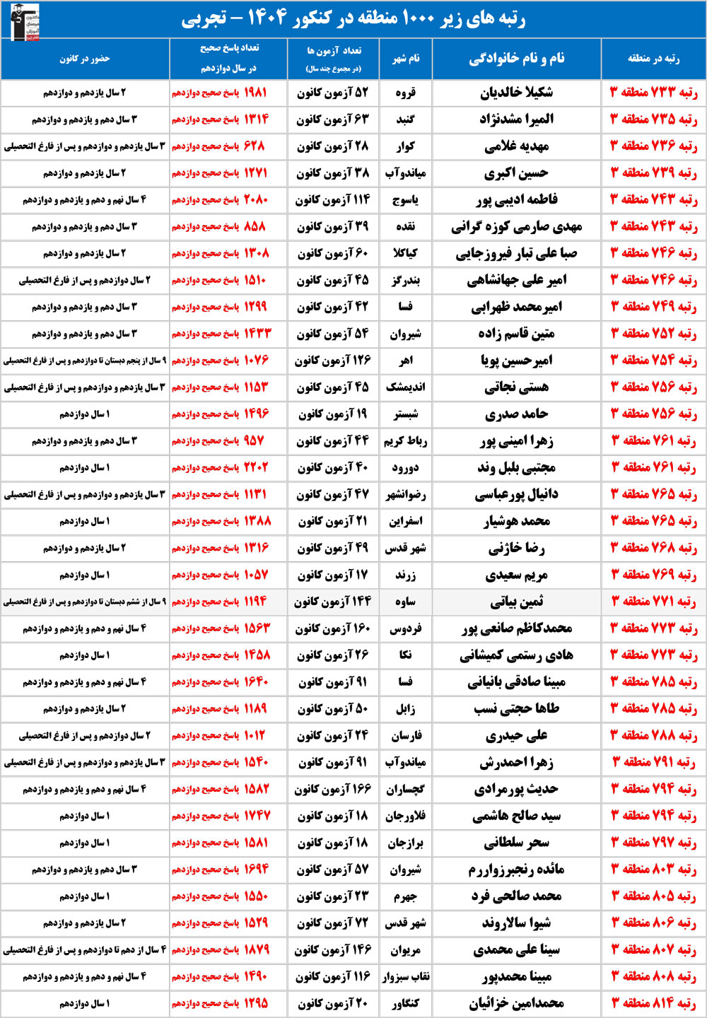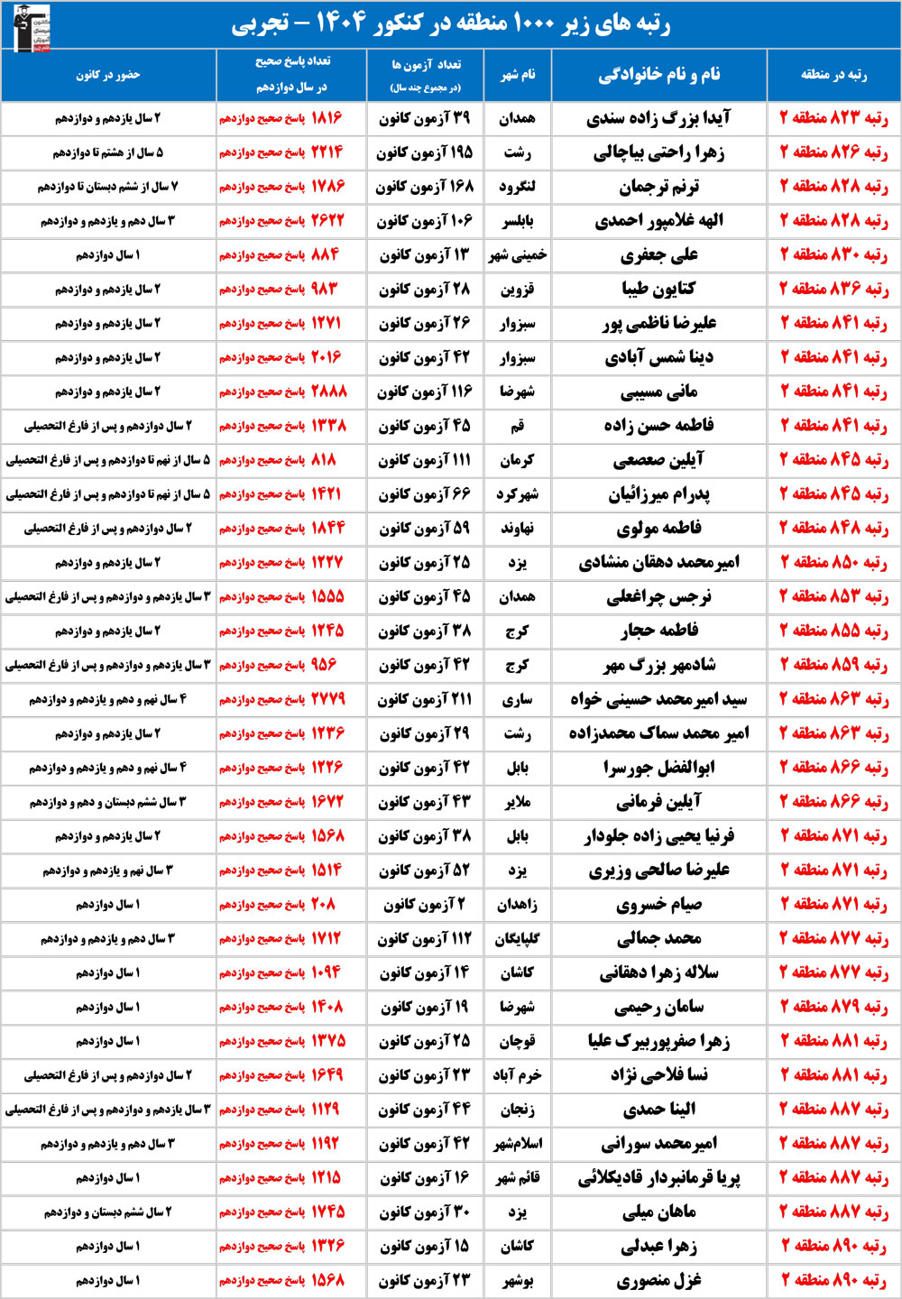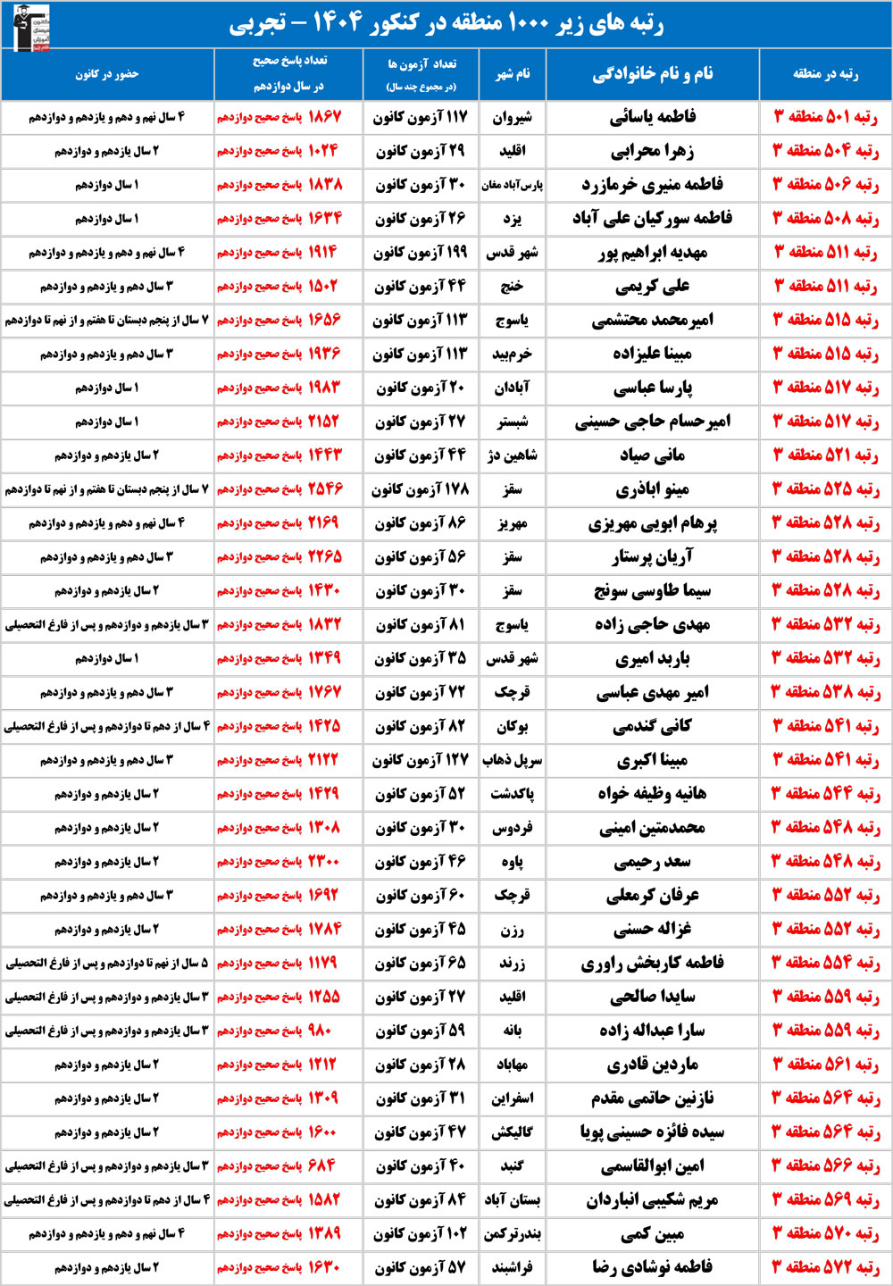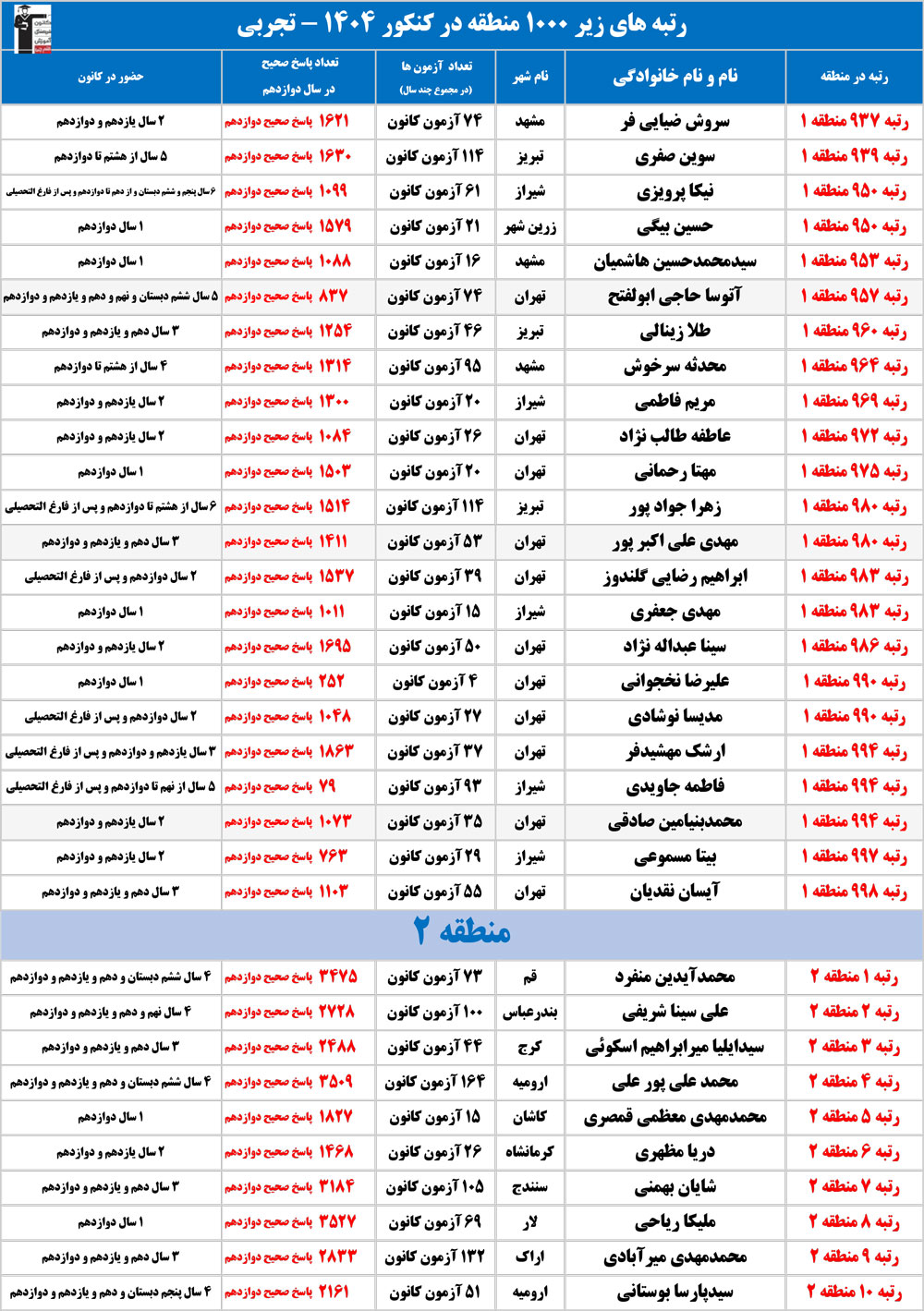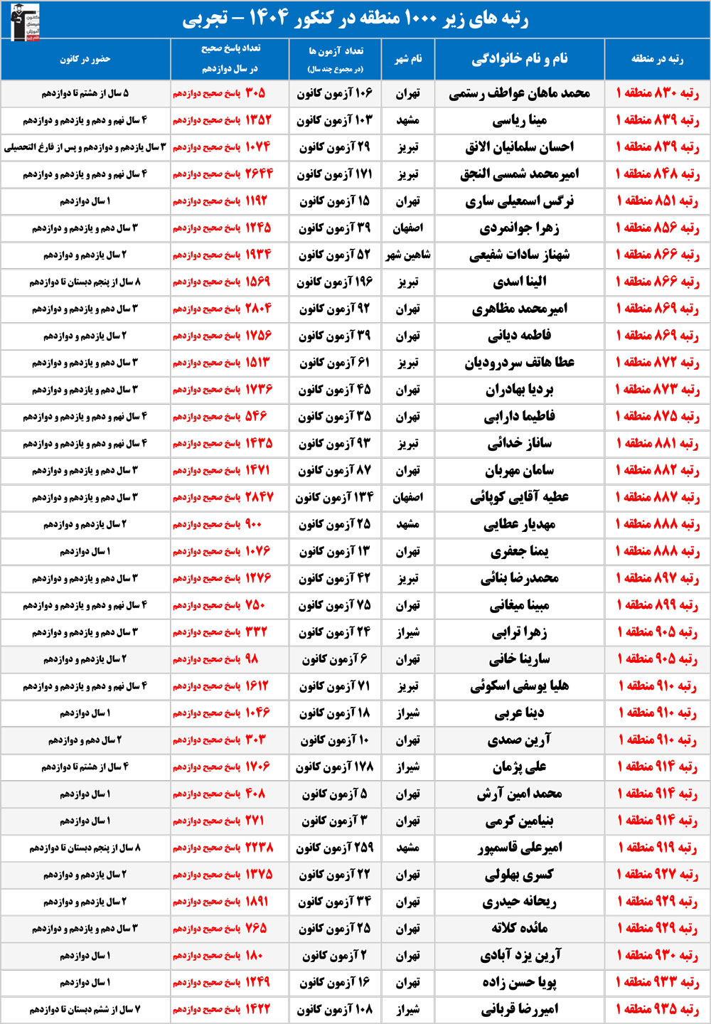 در ادامه با رتبه های زیر 1000 منطقه کانونی در کنکور 1404 در رشته تجربی آشنا شوید.