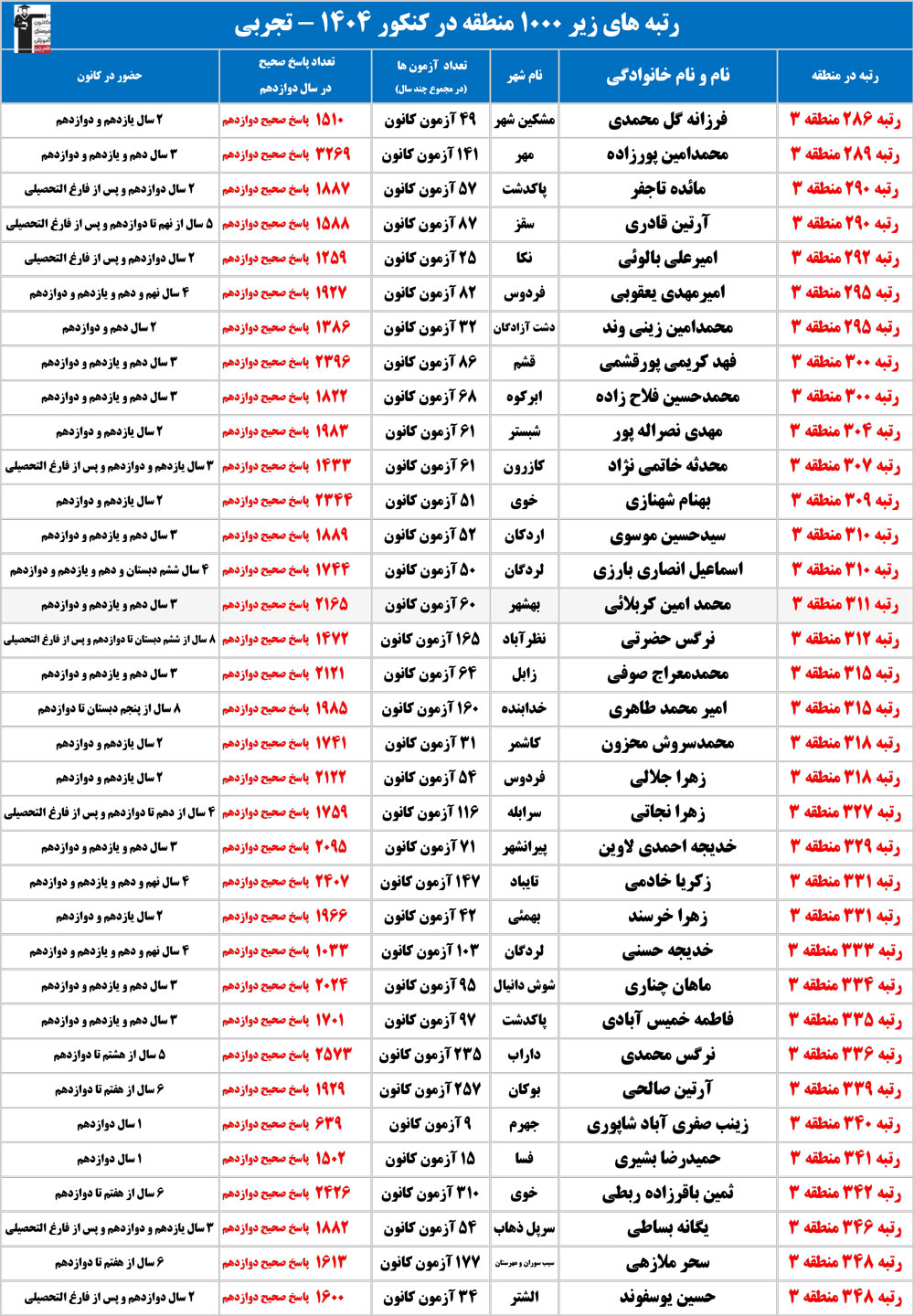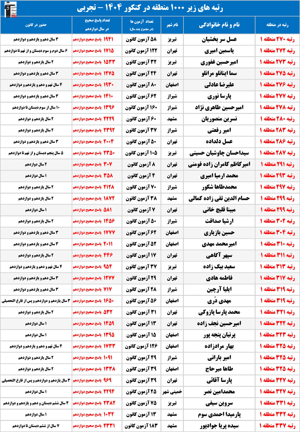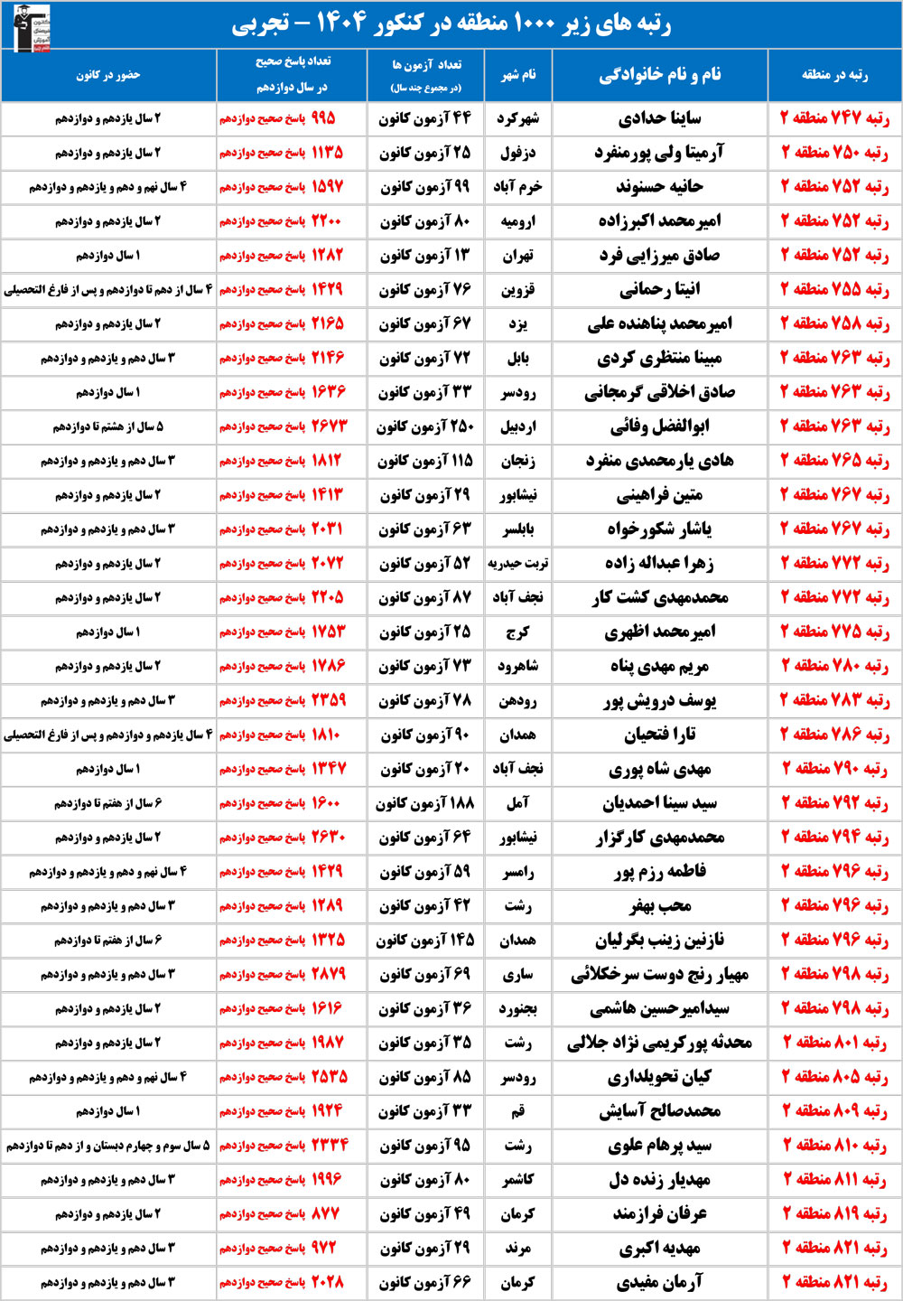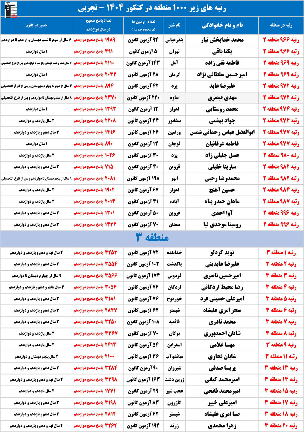 در ادامه با رتبه های زیر 1000 منطقه کانونی در کنکور 1404 در رشته تجربی آشنا شوید.