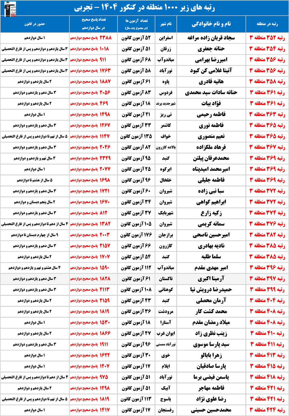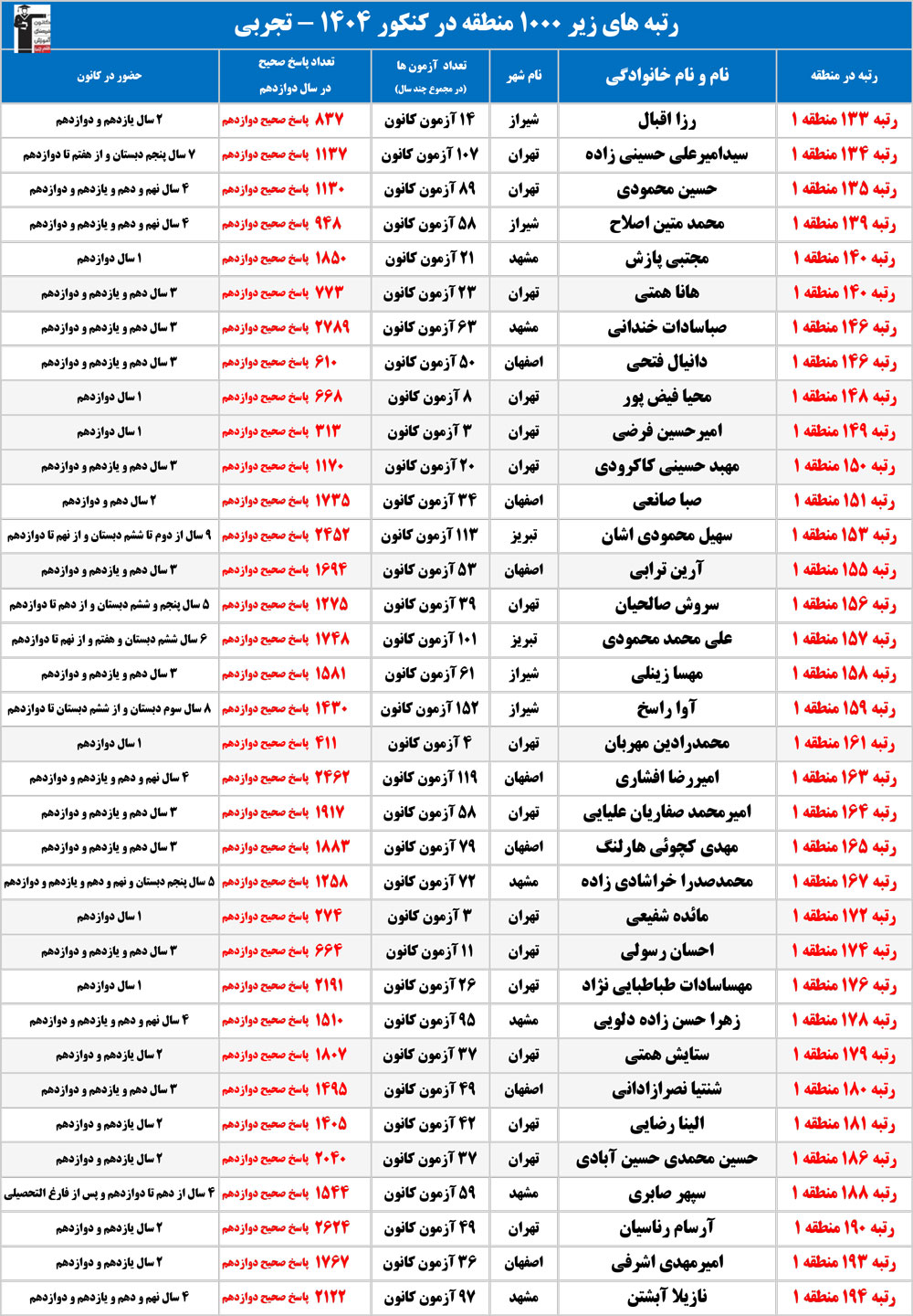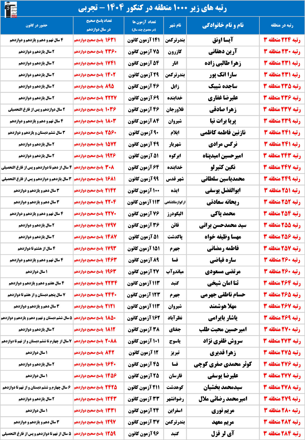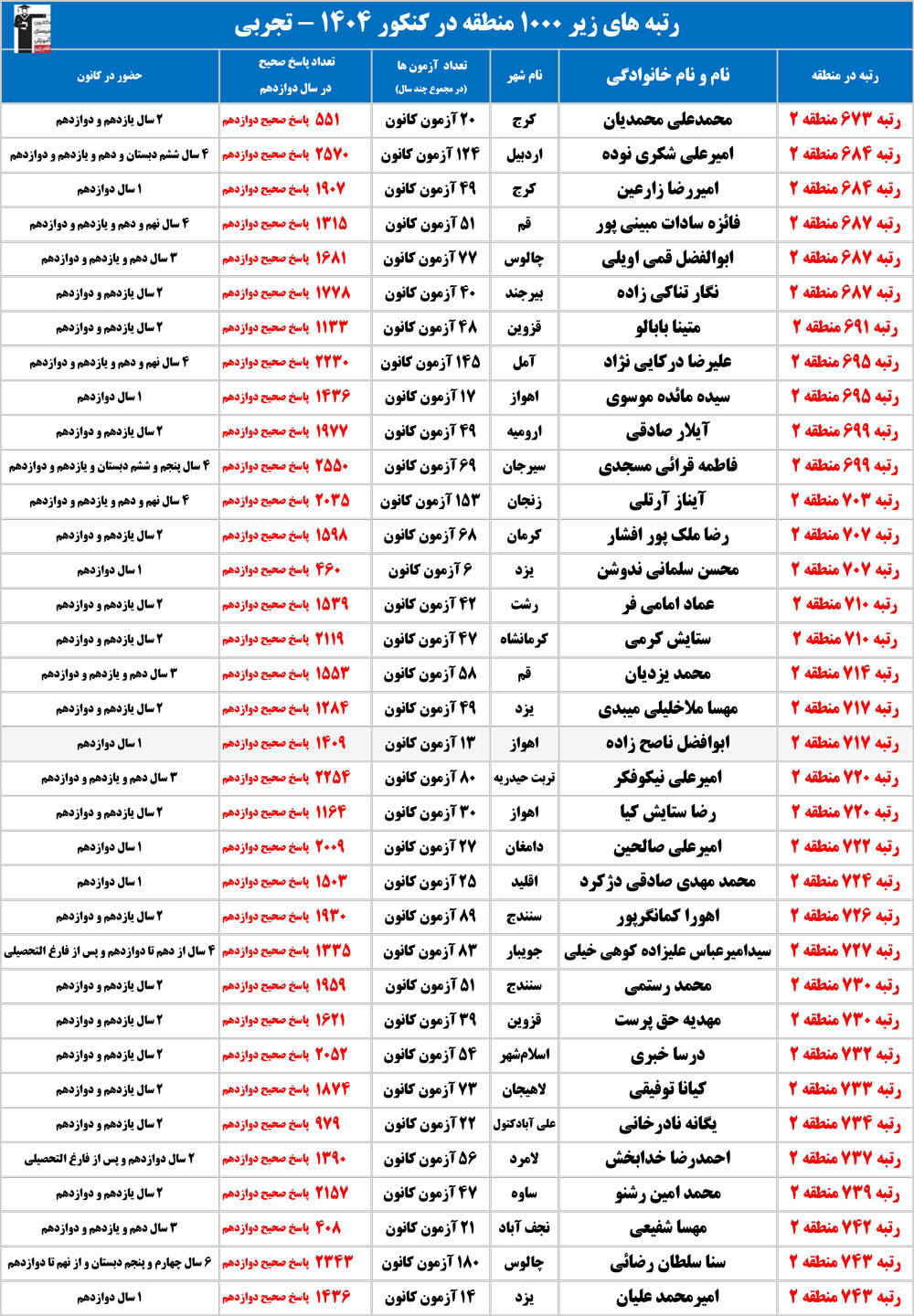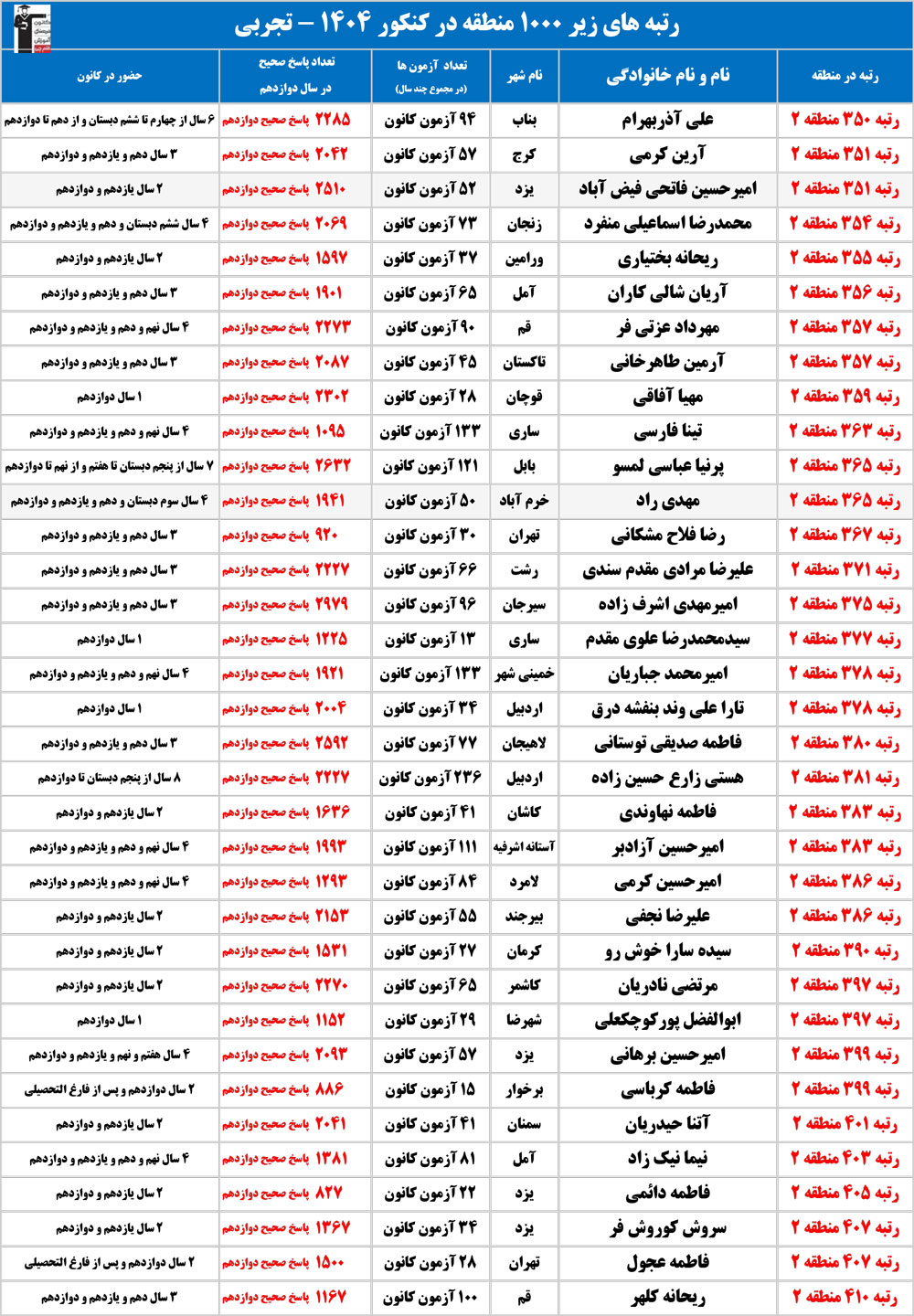 در ادامه با رتبه های زیر 1000 منطقه کانونی در کنکور 1404 در رشته تجربی آشنا شوید.