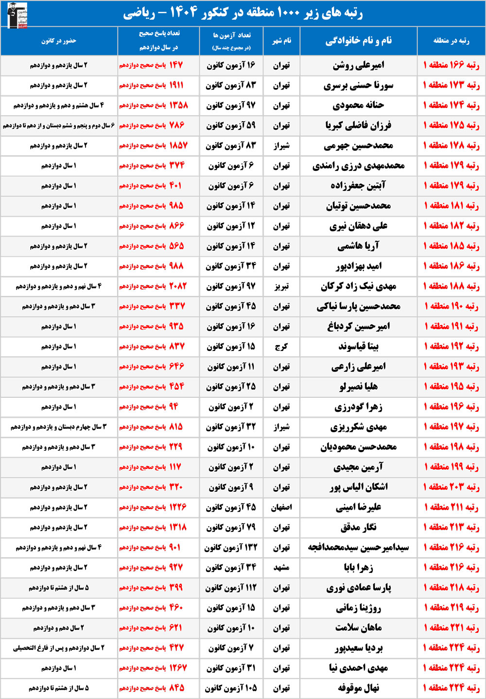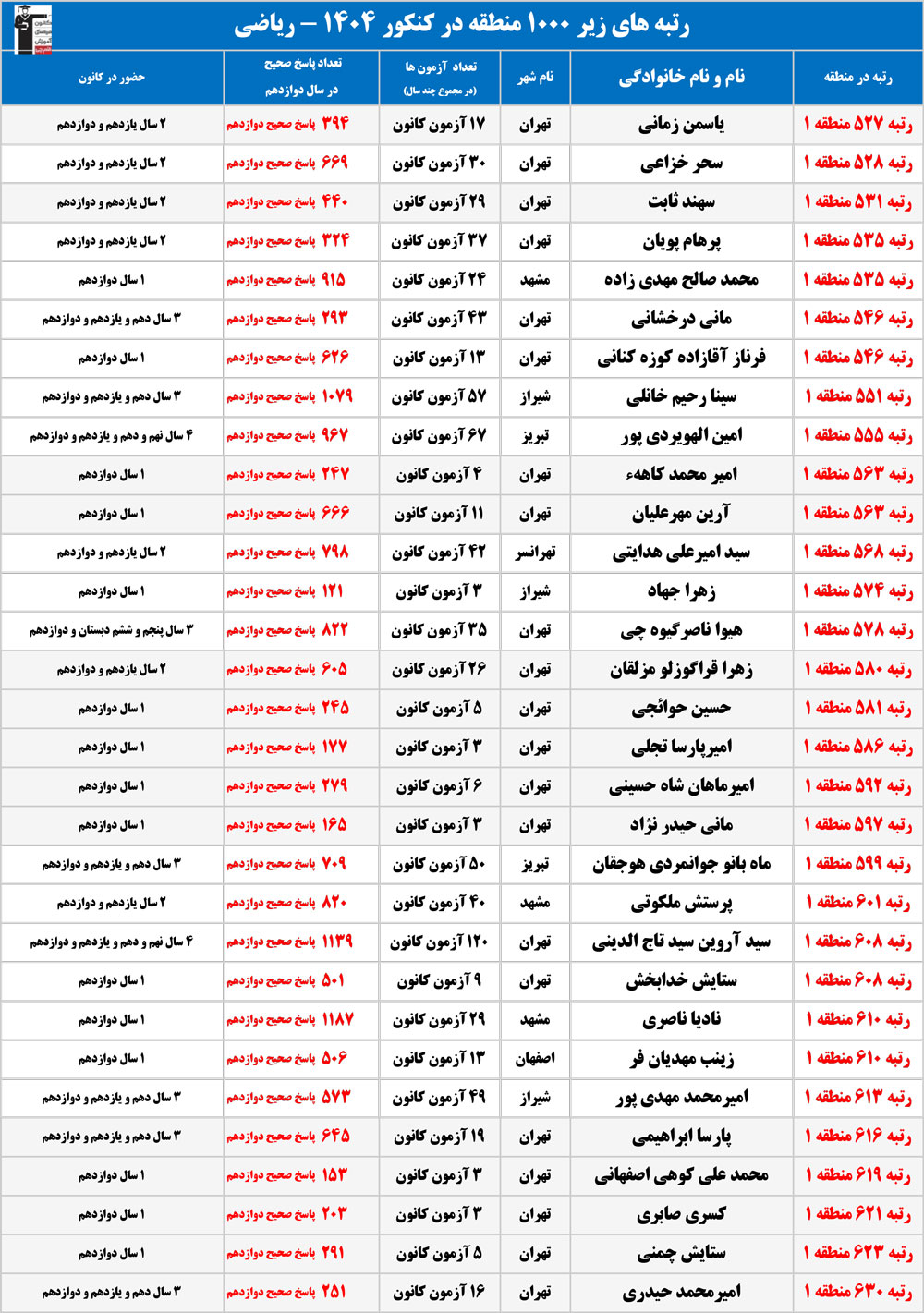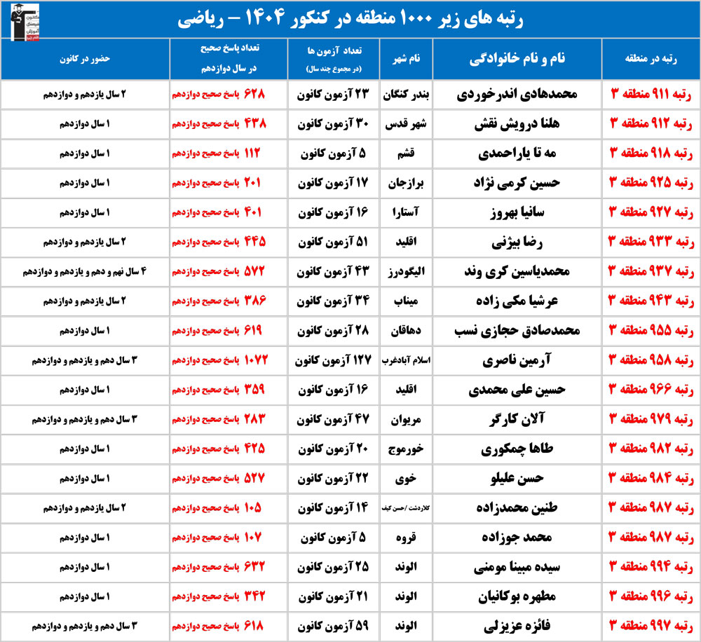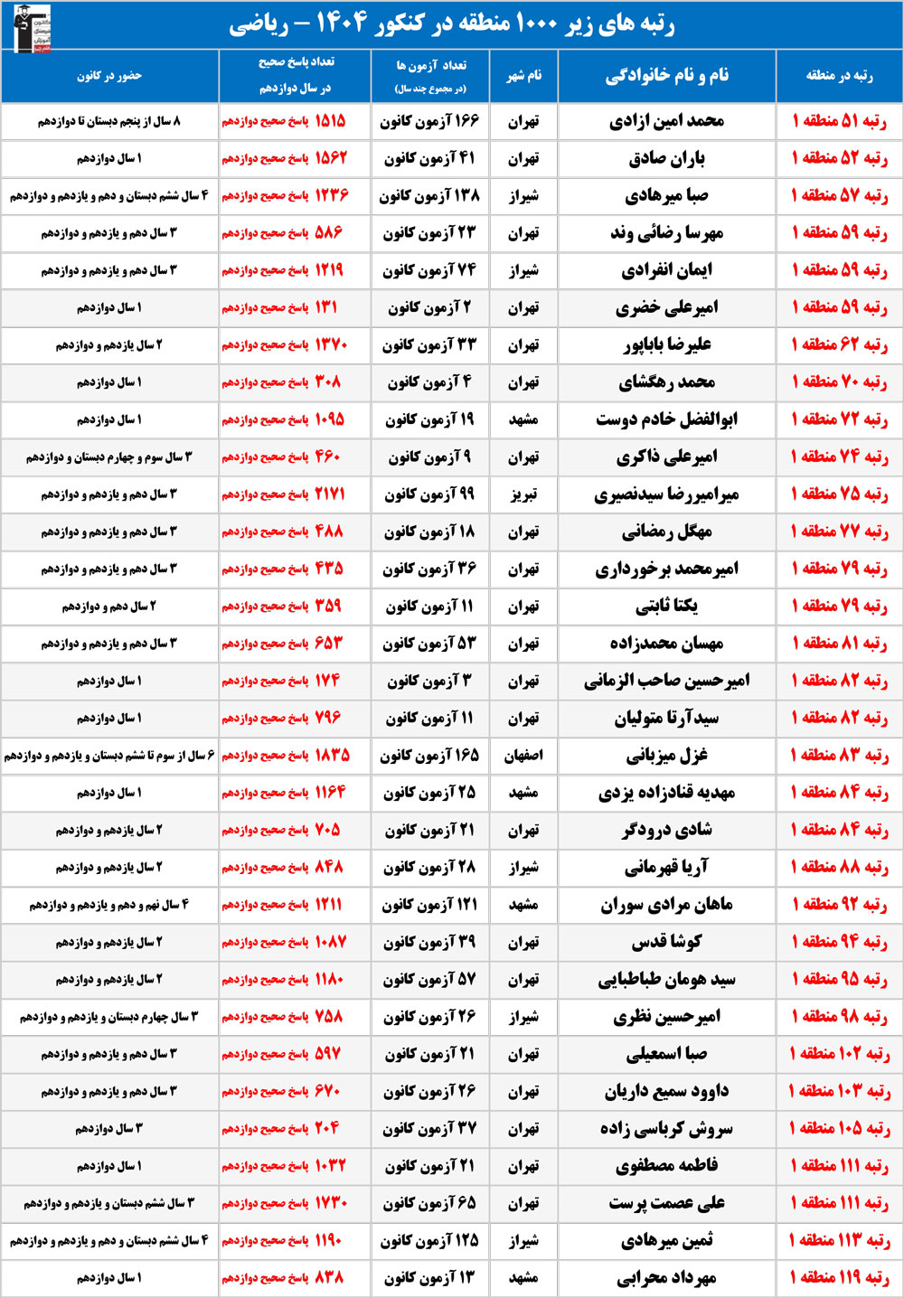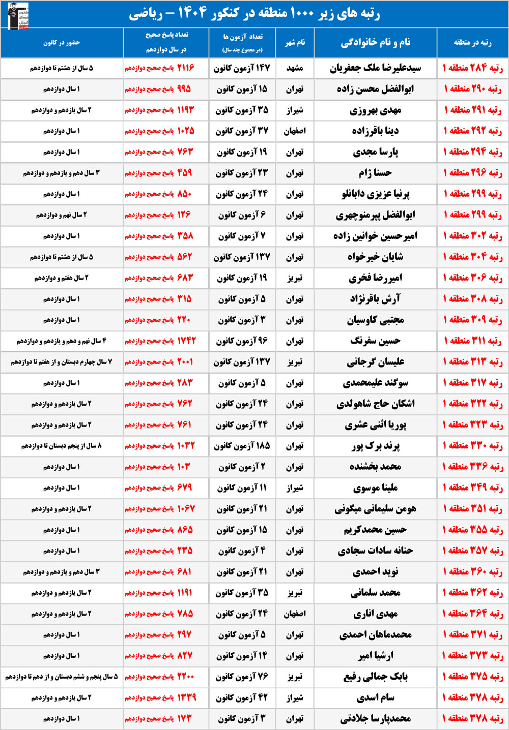 در ادامه با رتبه های زیر 1000 منطقه کانونی در کنکور 1404 در رشته ریاضی آشنا شوید.