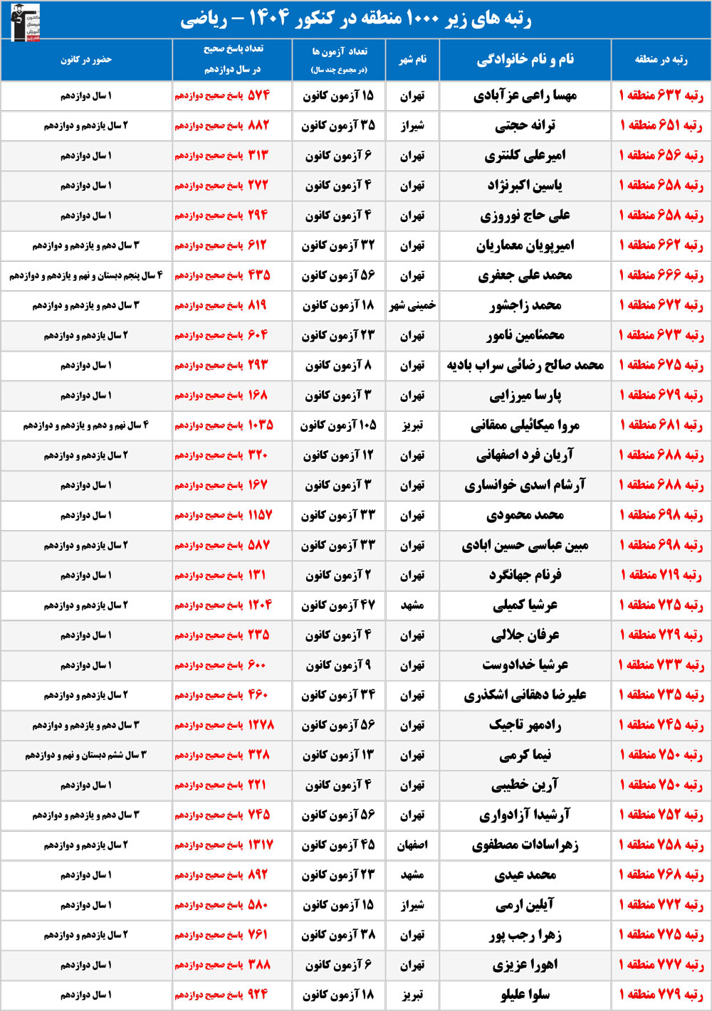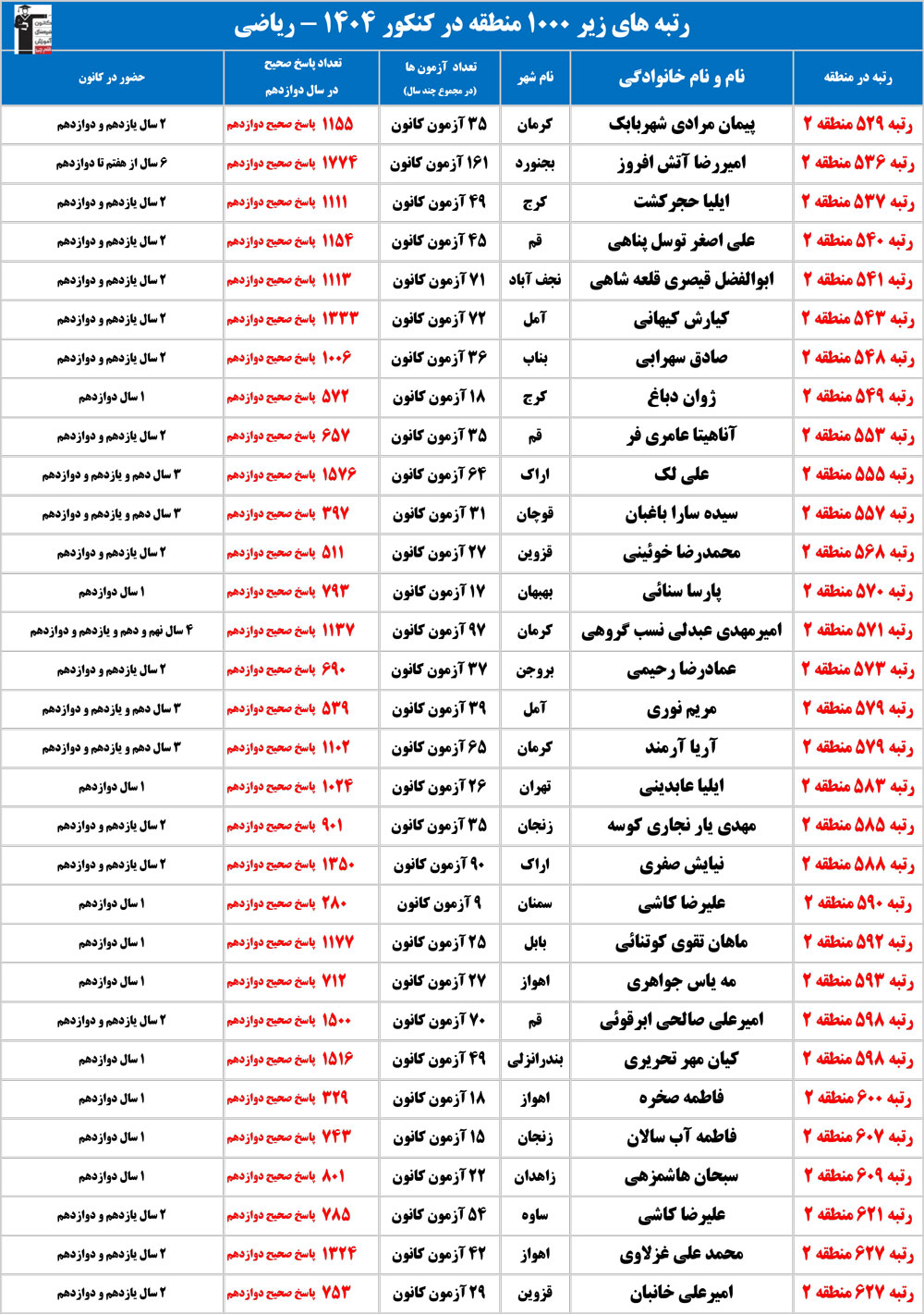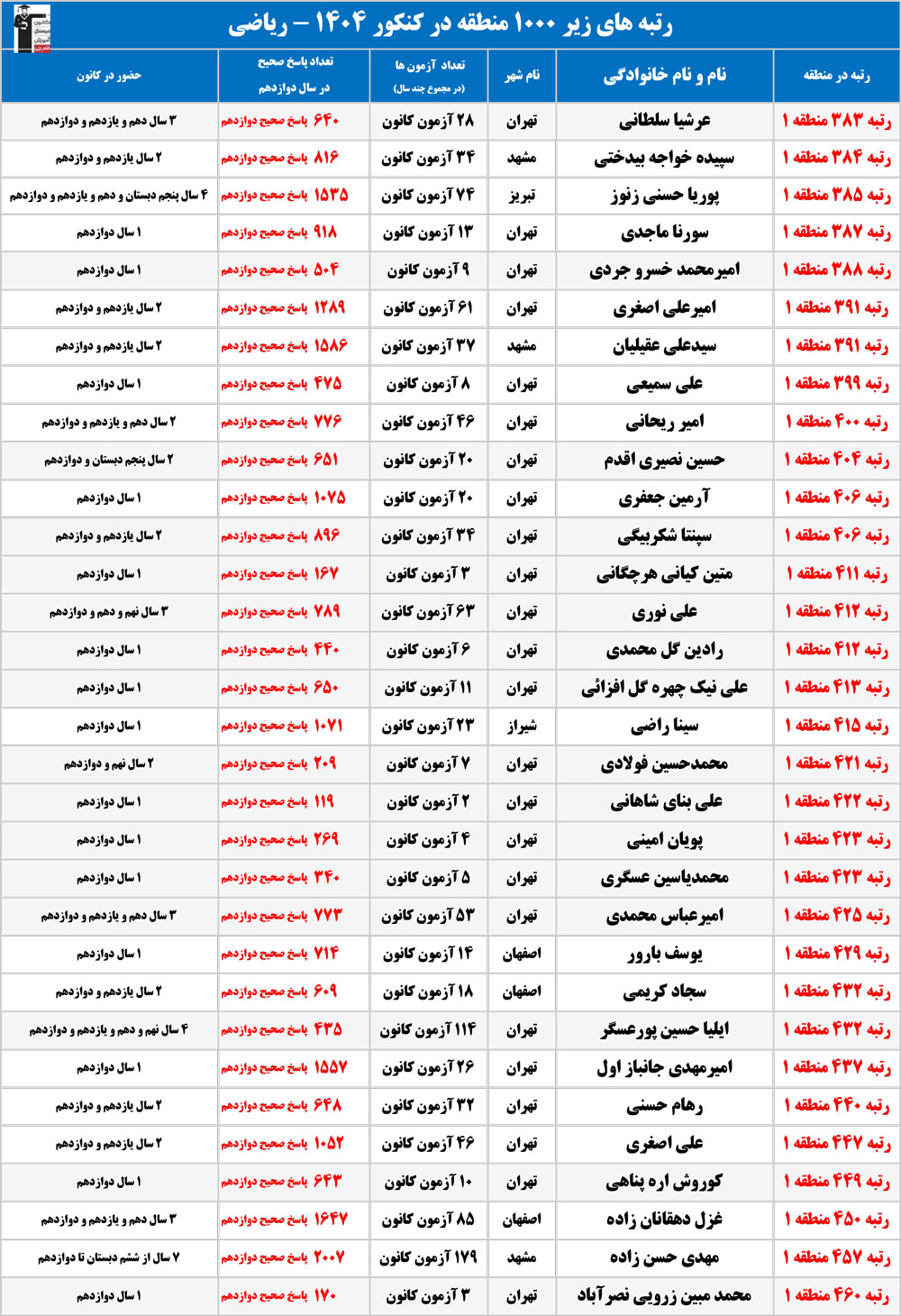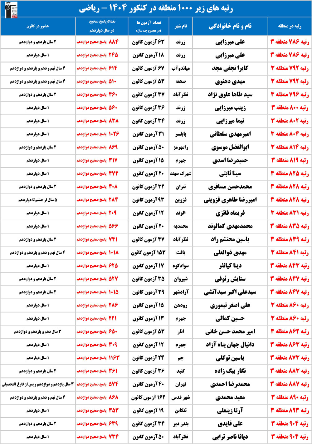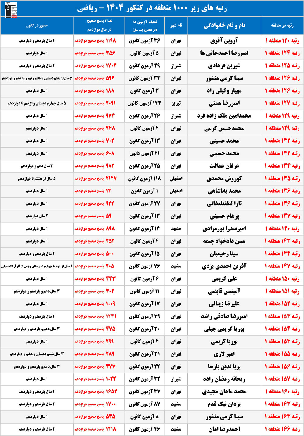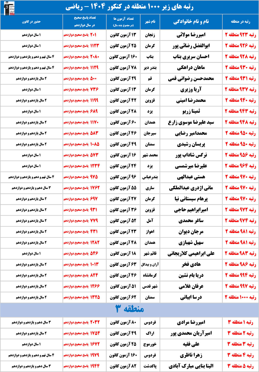 در ادامه با رتبه های زیر 1000 منطقه کانونی در کنکور 1404 در رشته ریاضی آشنا شوید.