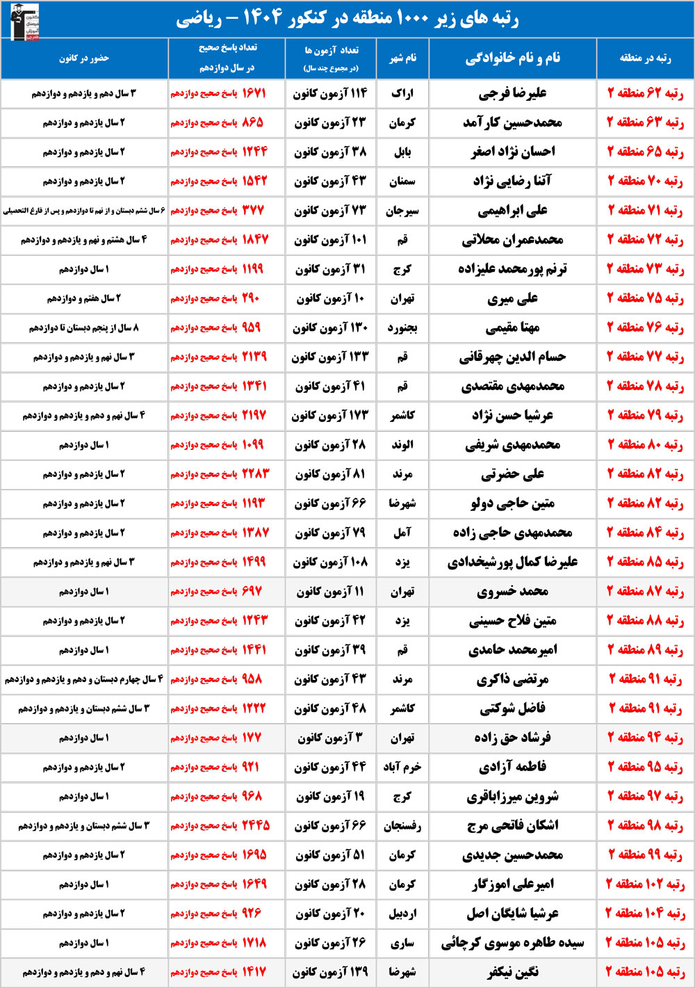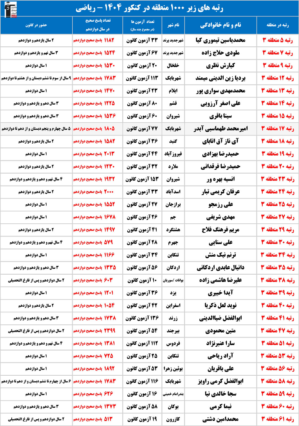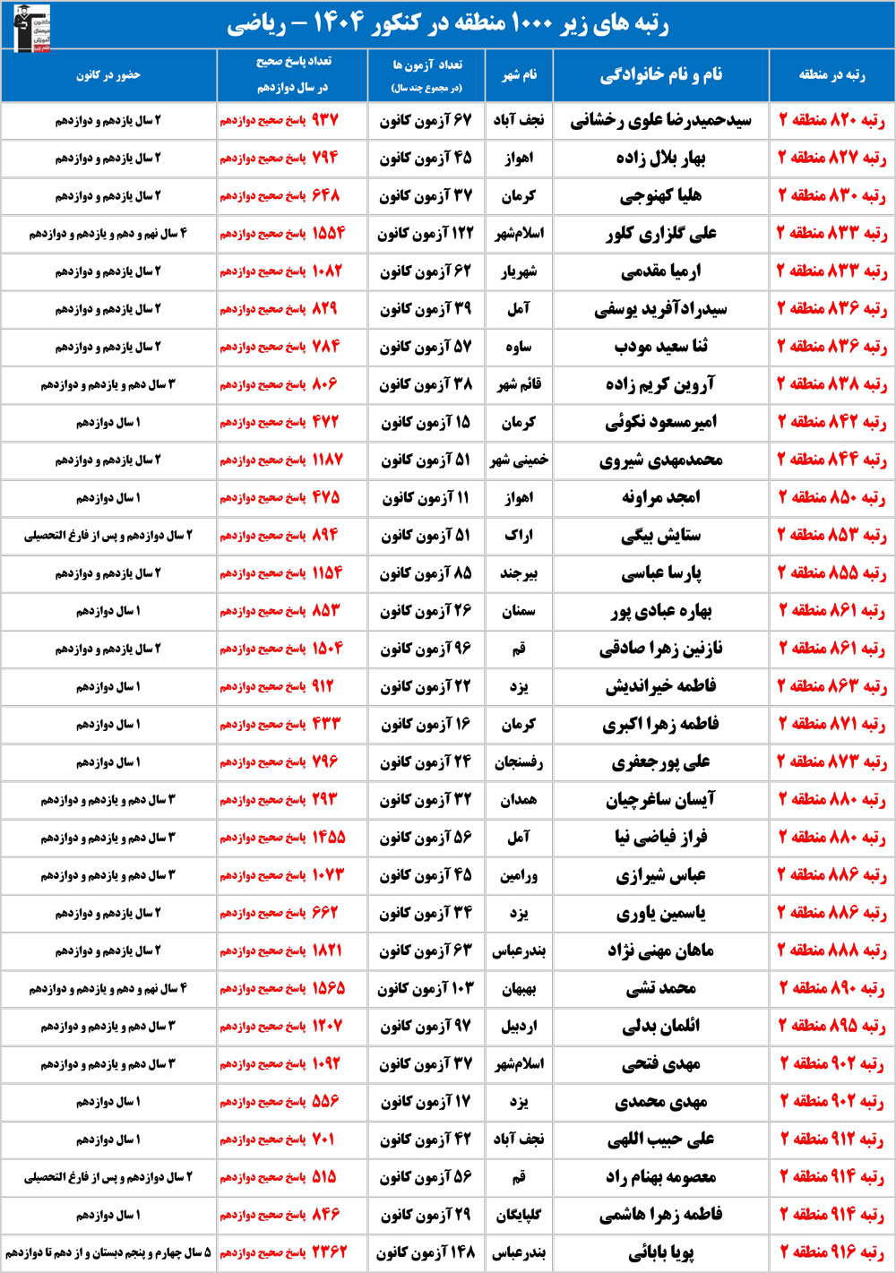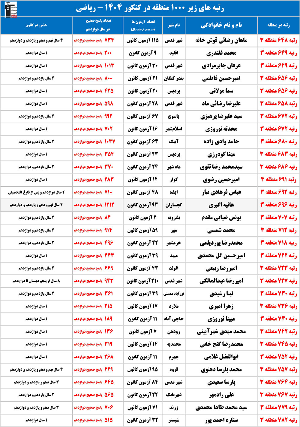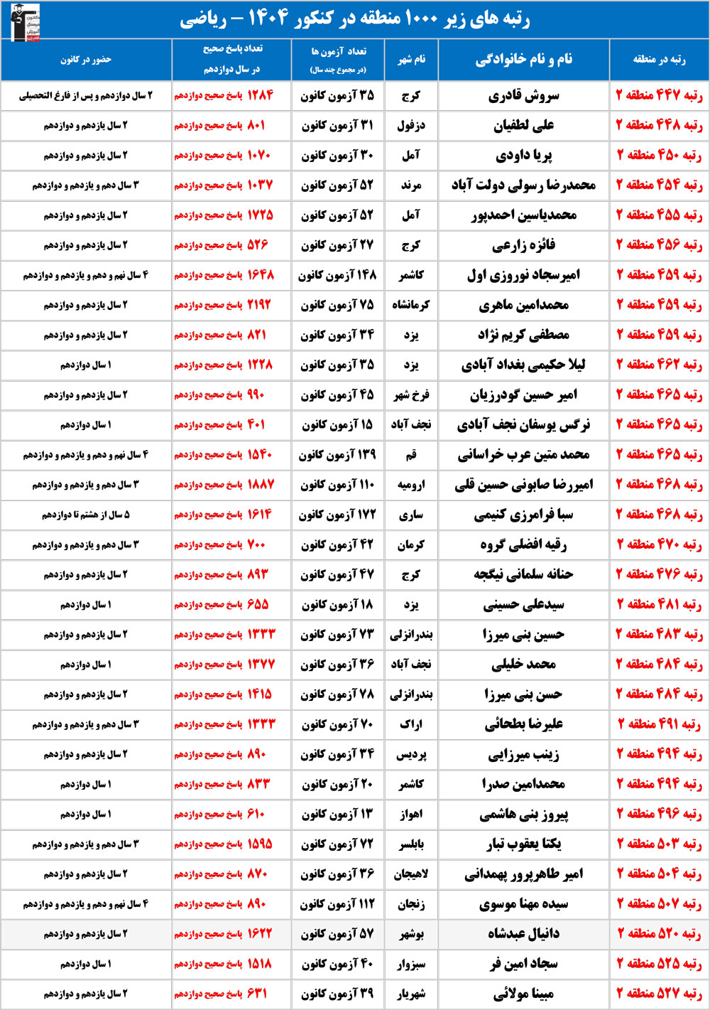 در ادامه با رتبه های زیر 1000 منطقه کانونی در کنکور 1404 در رشته ریاضی آشنا شوید.