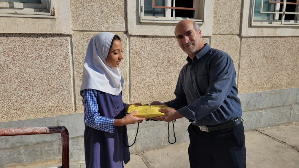 اهدای پکیج لوازم التحریر توسط صابر فتاحی مسئول پروژههای مدرسهسازی