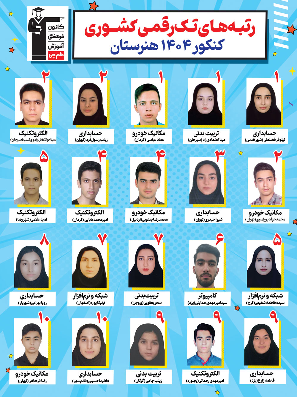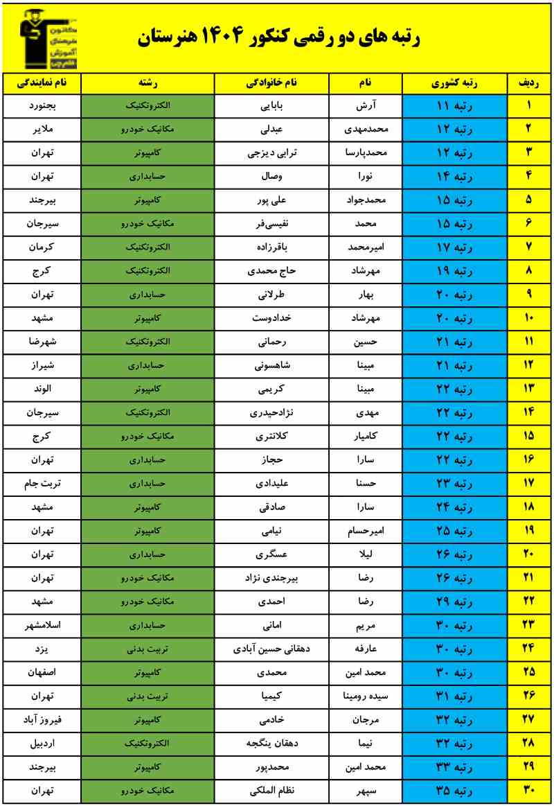 ضمن عرض تبریک به تمامی پذیرفته شدگان کنکور 1404 هنرستان، به اطلاع میرسانیم، تعداد رتبههای تک رقمی هنرستانیهای کانون تا این لحظه 20 رتبه و رتبه های دو رقمی 93 نفر میباشد.