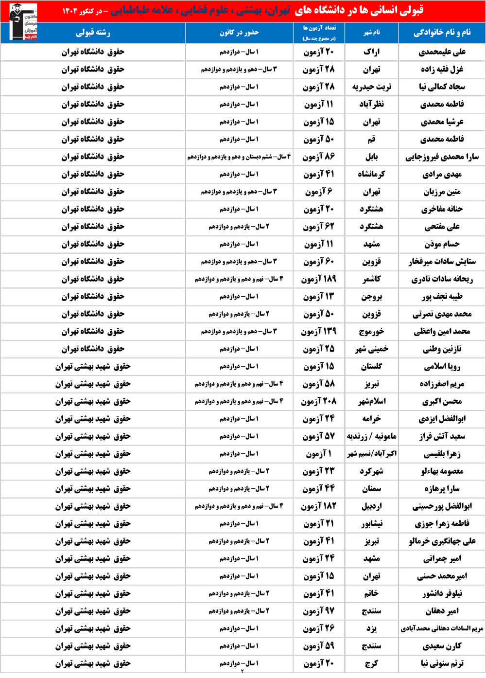 قبولی های کانونی (دانش آموزان کانون فرهنگی آموزش قلم چی) رشته های انسانی دانشگاه های تهران در کنکور 1404 تا این لحظه را در ادامه مشاهده کنید.
