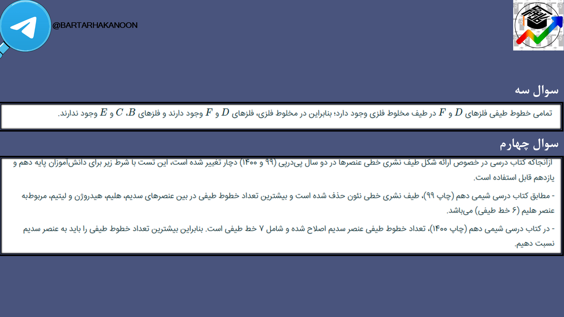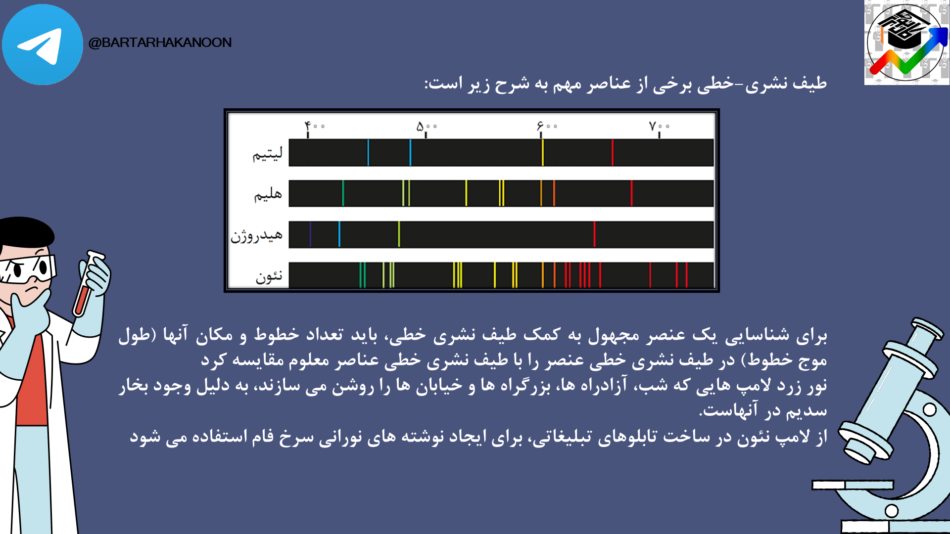 حواستون باشه: طیف نشری خطی عنصرها برخلاف طیف نور خورشید که پیوسته بود، یک طیف گسسته است.