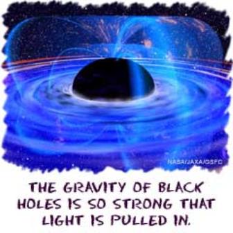 Black holes are areas in space where there is a huge amount of mass in a very small space. The gravity of this mass is so great that everything in the area is pulled toward the mass. Even light, with its tiny mass, is pulled into the center of the hole. No object can escape the gravitational pull of a black hole.